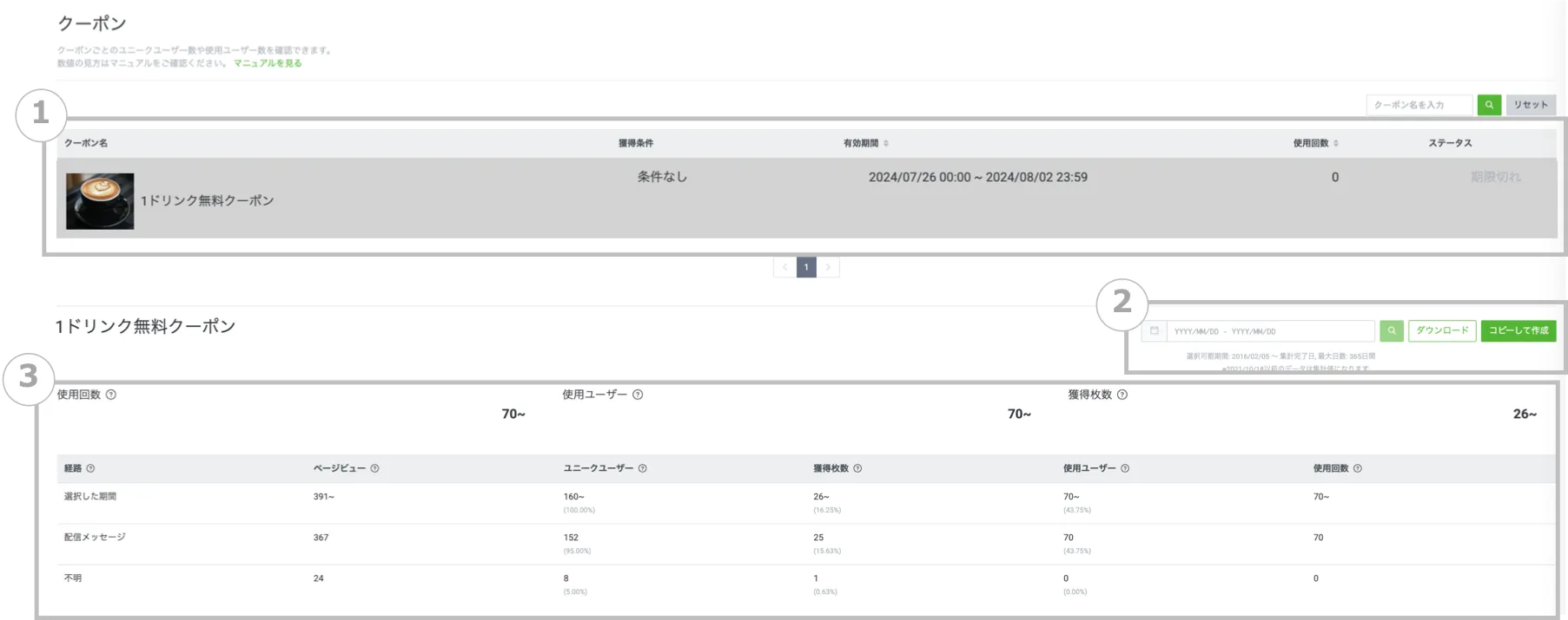 | ③ | ①で選択したクーポンの、②の期間中の統計情報が表示されます。 |