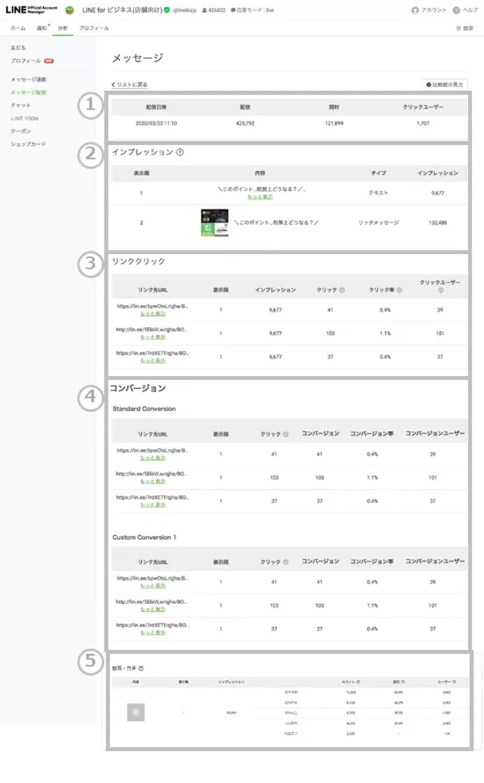 | ③ | URL ごとのクリックに関する統計を表示します。メッセージ内のタップ可能なURL形式メッセージがタップされるとクリックとしてカウントされます。クリックの結果が表示されるメッセージフォーマットはURLを含むテキスト、リッチメッセージ、リッチビデオメッセージ、クーポン、リサーチ、カードタイプメッセージです。