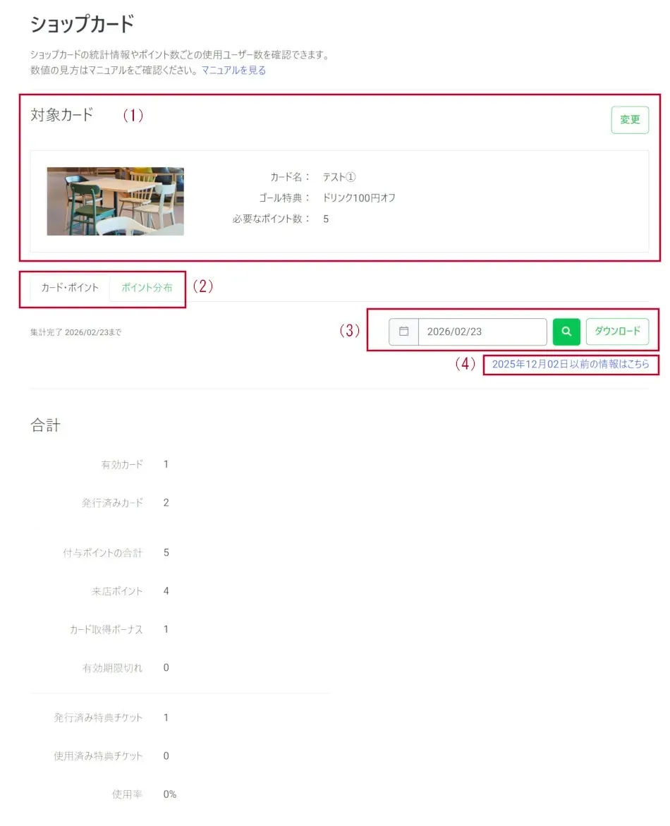 | (4) | 2025年12月2日以前のデータを確認する場合はここをクリックします。 ※2025年12月2日以前に公開したショップカードを選択中の場合のみ、このリンクが表示されます。 |
