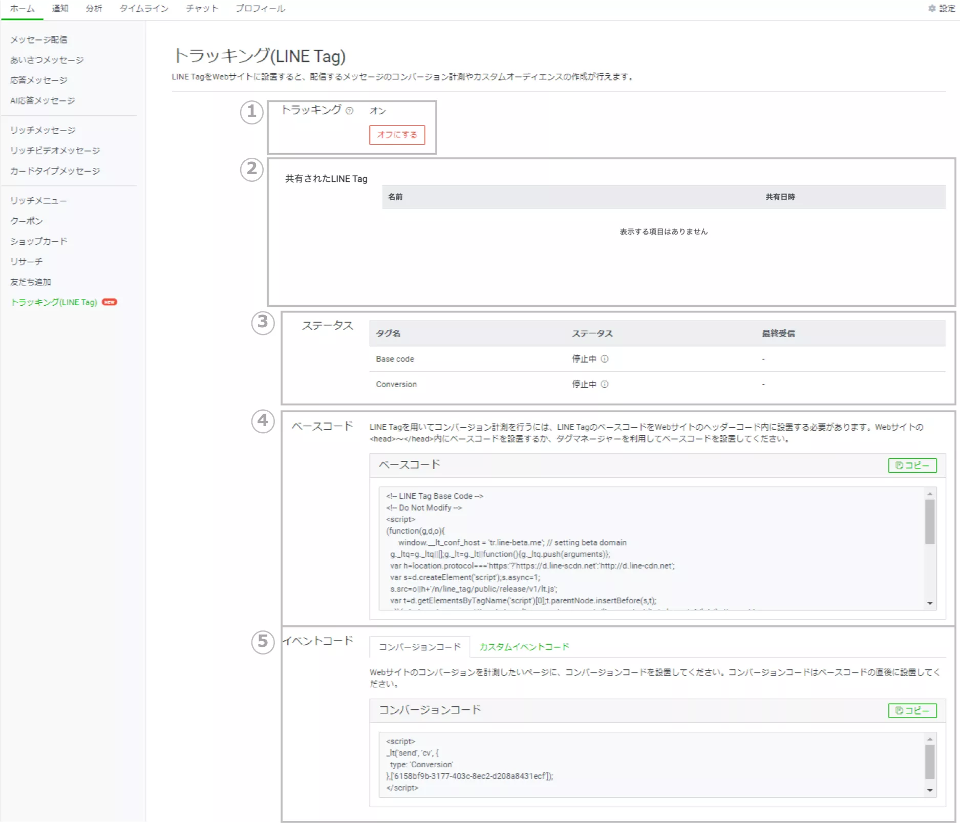 「オン」にするとLINE Tagによる計測を行います。(デフォルトはオンの状態です)