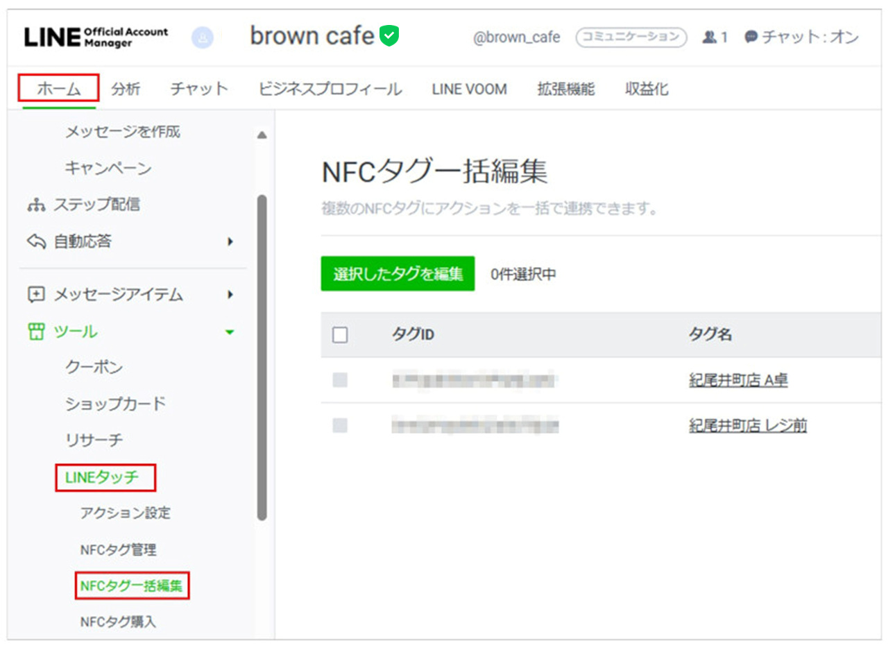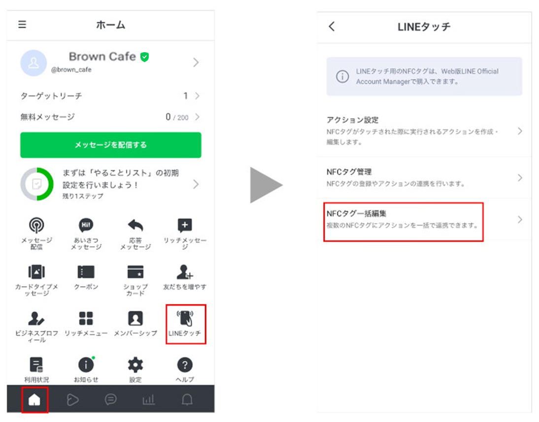 1 [ホーム]>[LINEタッチ]>[NFCタグ一括編集]をクリックします。