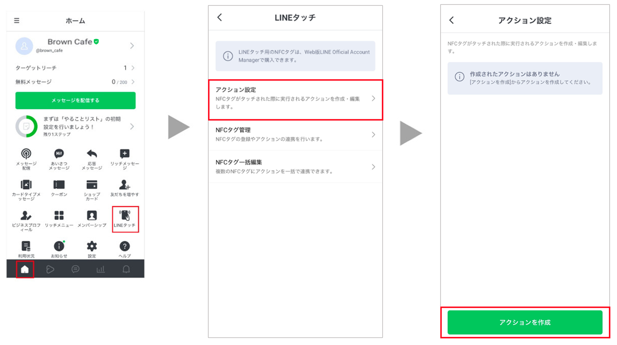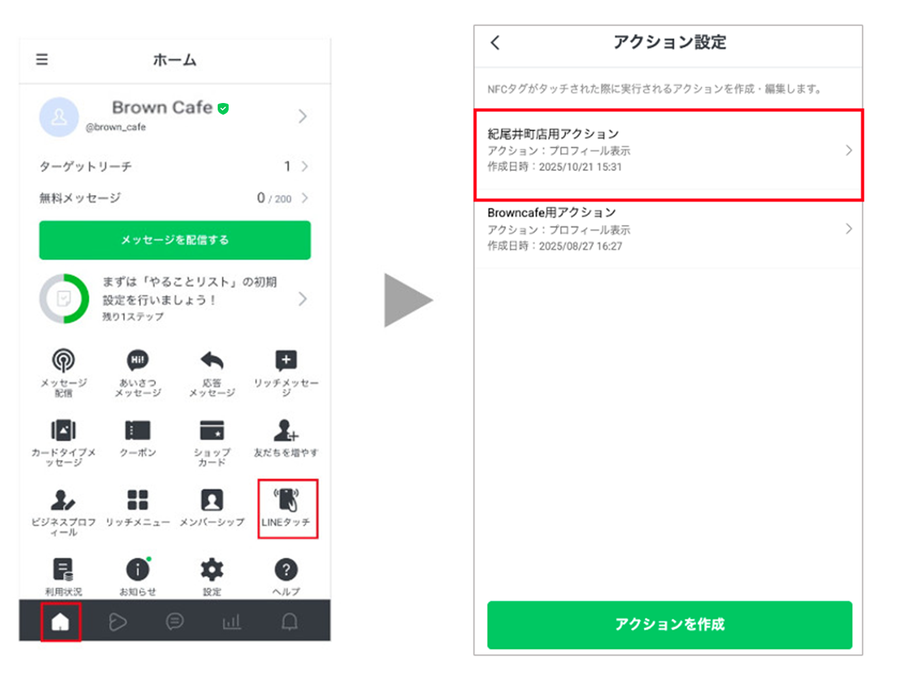 1 [ホーム]>[LINEタッチ]>[アクション設定]>[アクションを作成]をタップします。