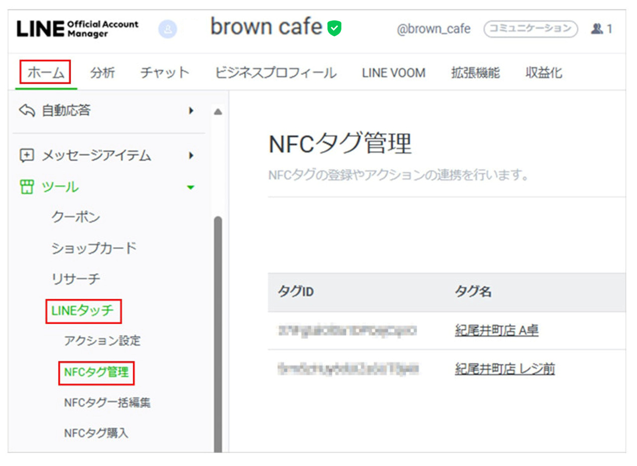 1 [ホーム]>[LINEタッチ]>[NFCタグ管理]をクリックします。