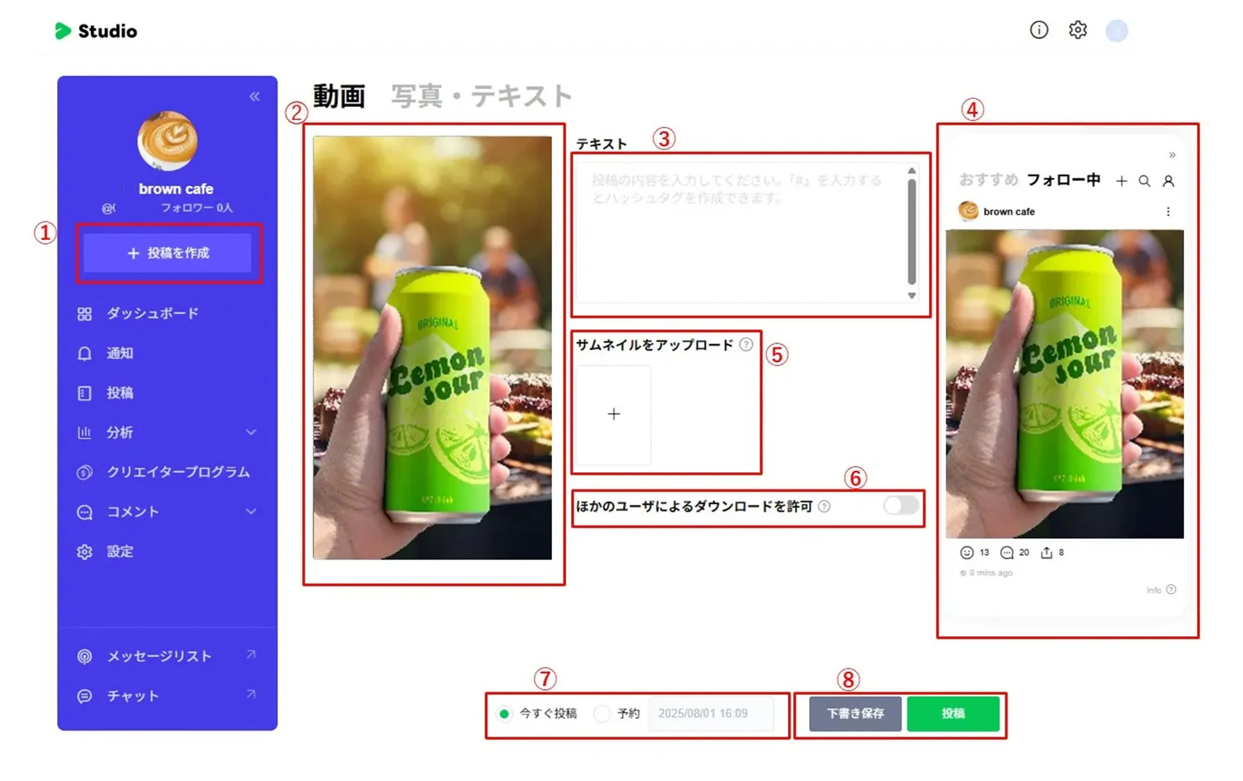 | ⑧ | 内容を編集後、[下書き保存]または[投稿/投稿を予約]を選択します。 ※同時刻に投稿予約を行った場合、一覧画面で保存した順に番号がつき、その番号どおりに予約・配信されます。 |