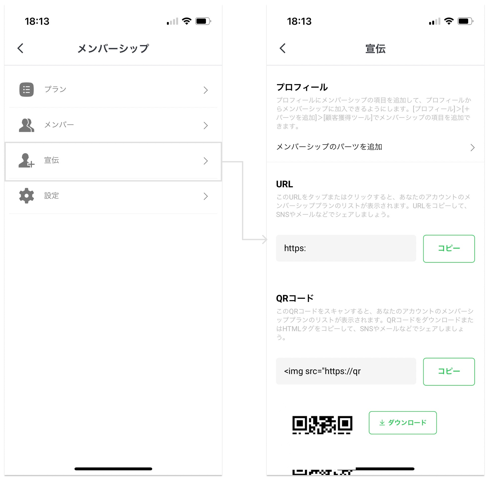 [メンバーシップ]>[宣伝]をタップし、プロフィールの設定やURL/QRコードを取得します。