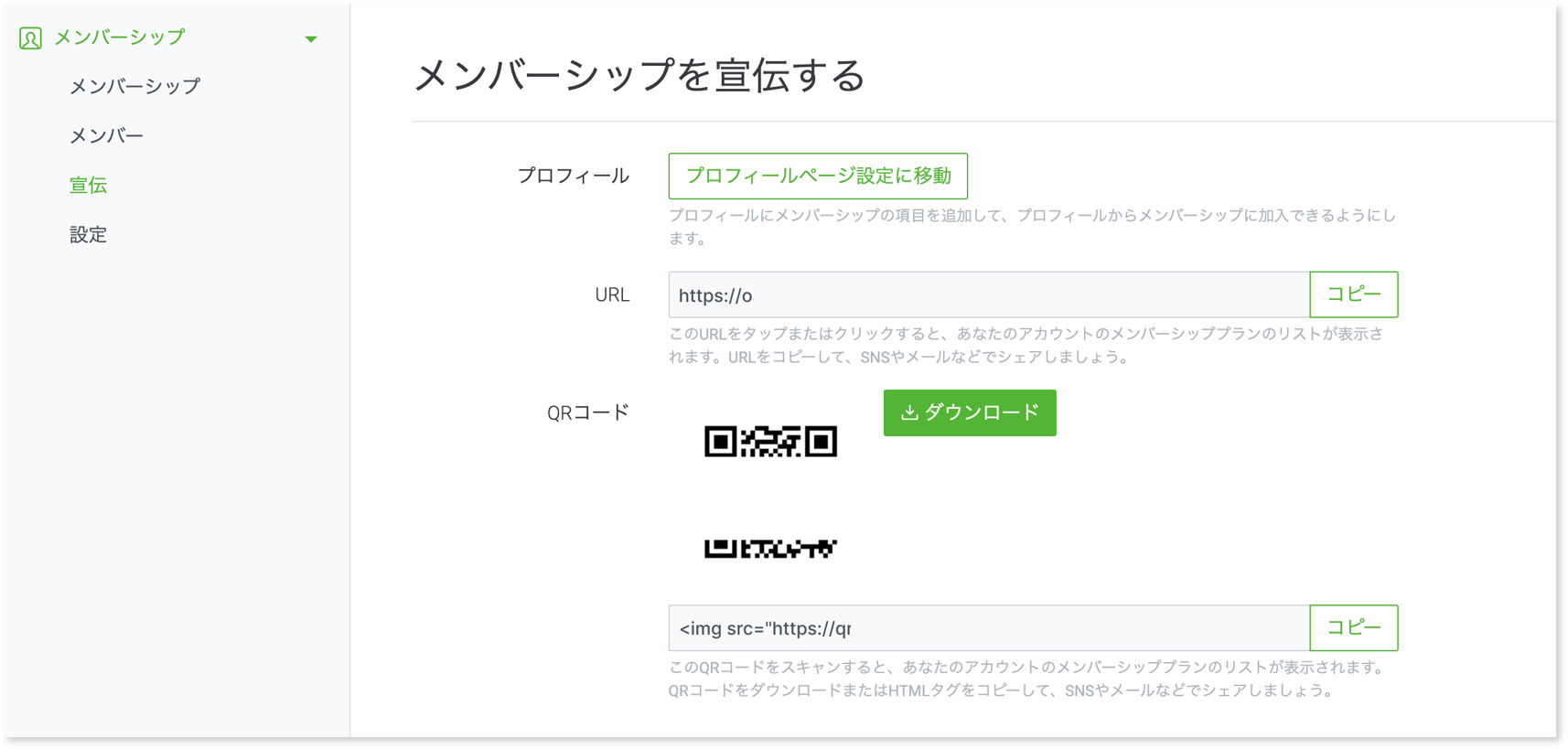 メンバーシップを宣伝するための設定やURL/QRコードの取得ができます。