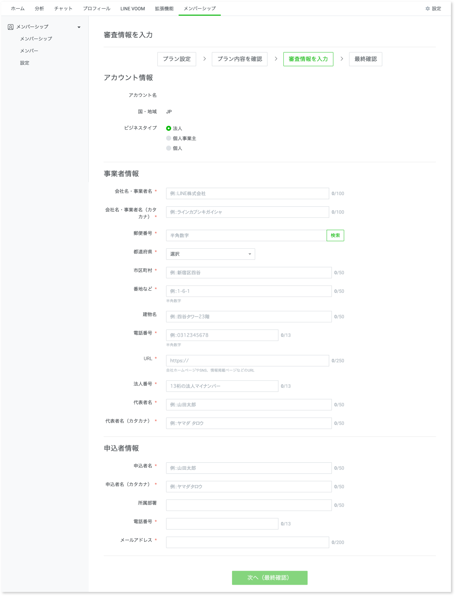 審査情報を入力し、「次へ(最終確認)」を選択し、確認ページへ進みます。
