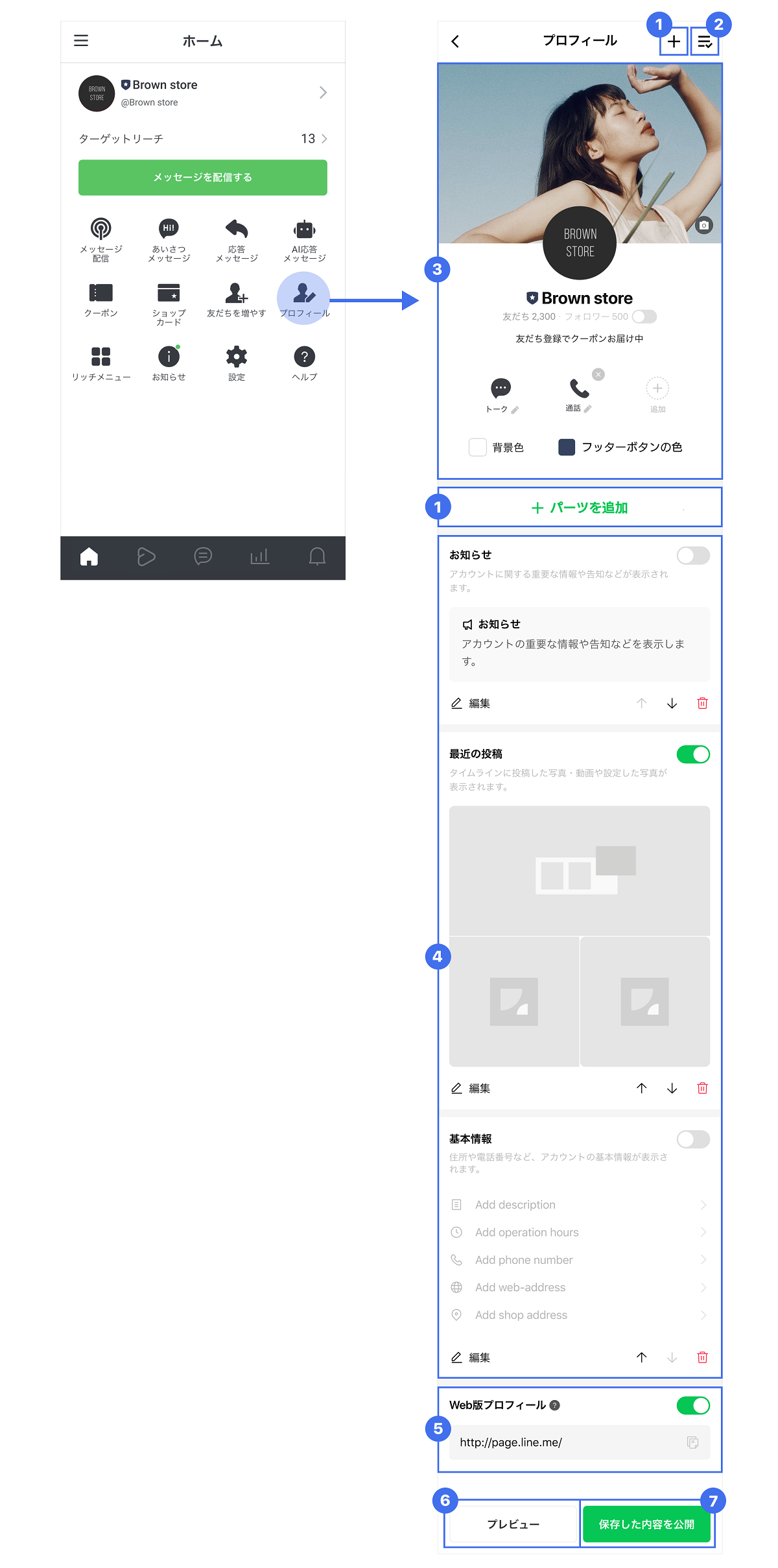 プロフィールに表示される「ボタン」が設定できます。 「トーク」を必須として、ボタンは3つまで設定可能です。 登録したボタンはフローティングバーにも反映されます。 |
