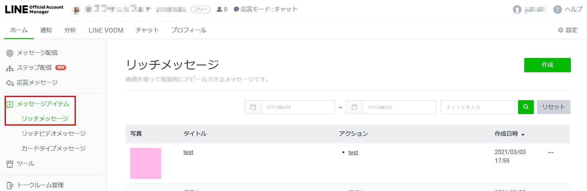 [メッセージアイテム]>[リッチメッセージ]を選択後、「作成」をクリックし新規作成画面に遷移します。