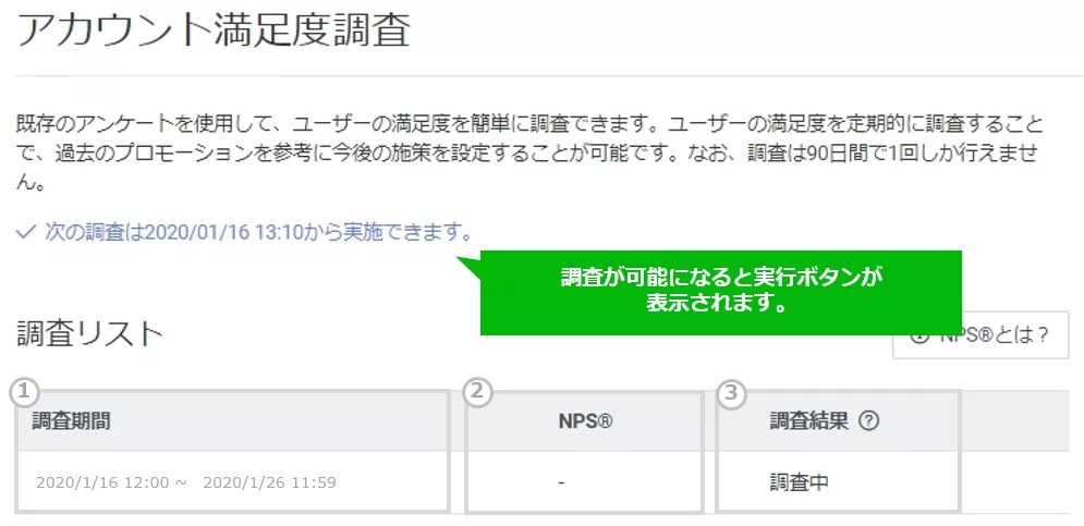 調査期間は10日期間です。② NPS®のスコアが表示されます。 ③ 調査結果のステータスについて表示されます。