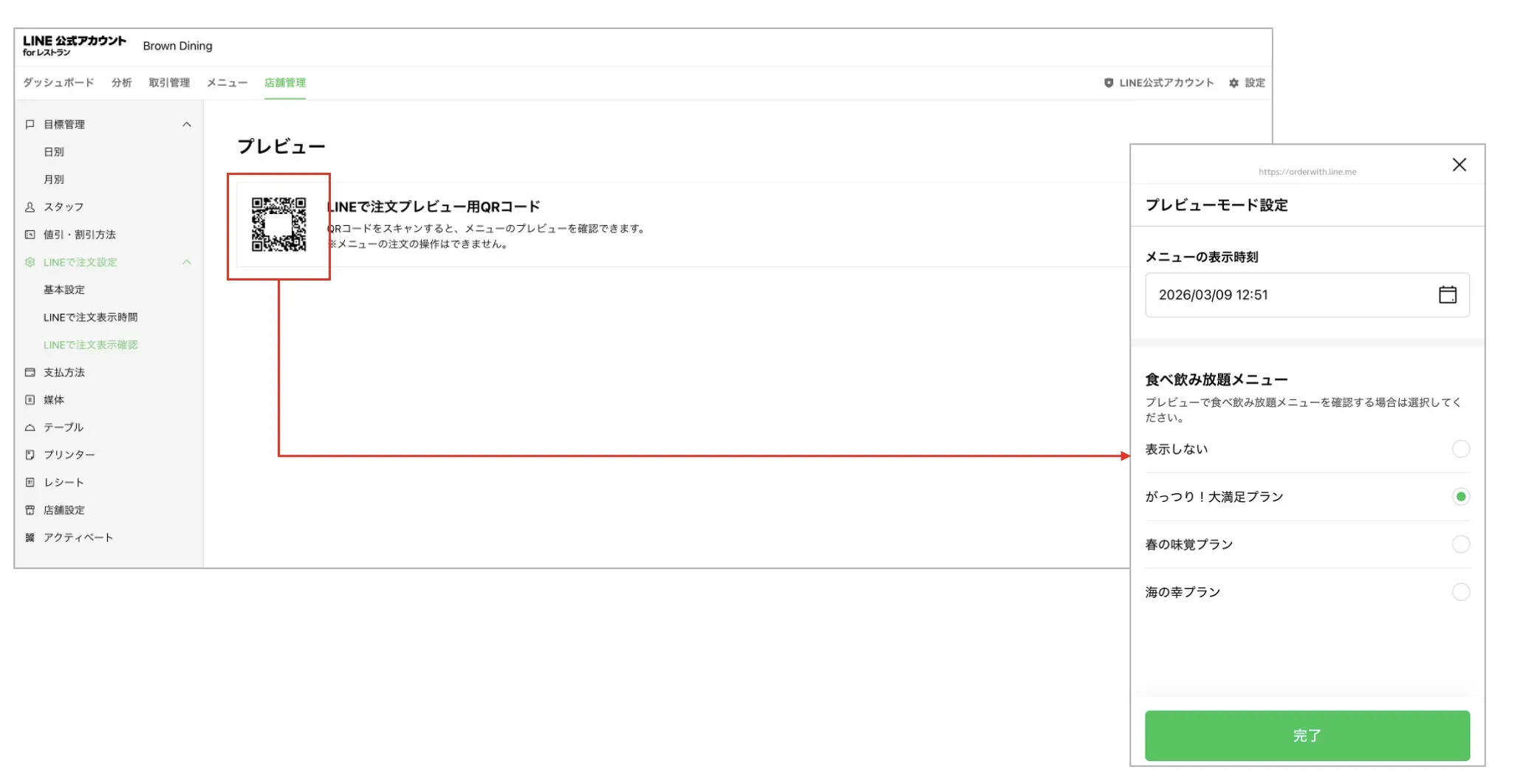 | プレビュー用QRコード(二次元コード) | QRコードを読み取ってプレビュー画面を表示します。曜日・時間の設定に合わせてメニューが切り替わるかご確認ください。 ※メニューの表示時刻は過去の日時も選択可能ですが、過去のメニューは表示できません。 |