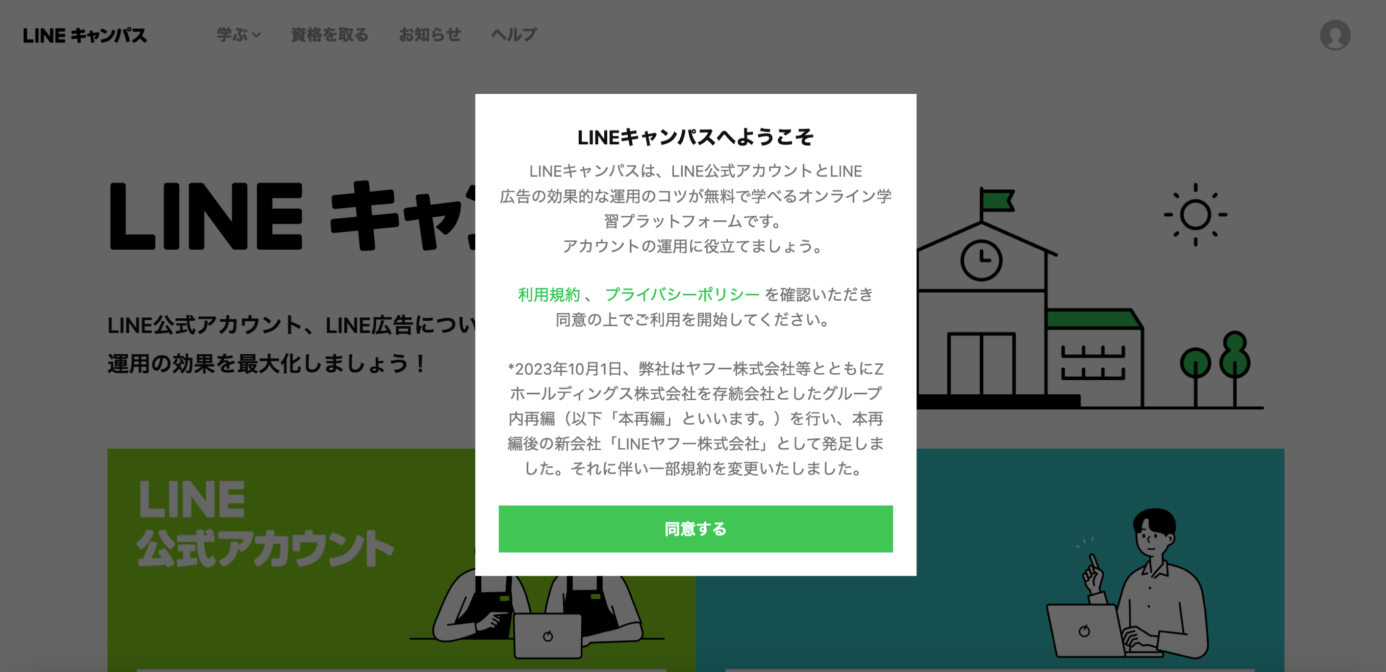 3. ログインが完了。初回ログイン時のみ、利用規約、プライバシーポリシー同意のポップアップが表示されます。ご確認の上ご利用を開始してください。