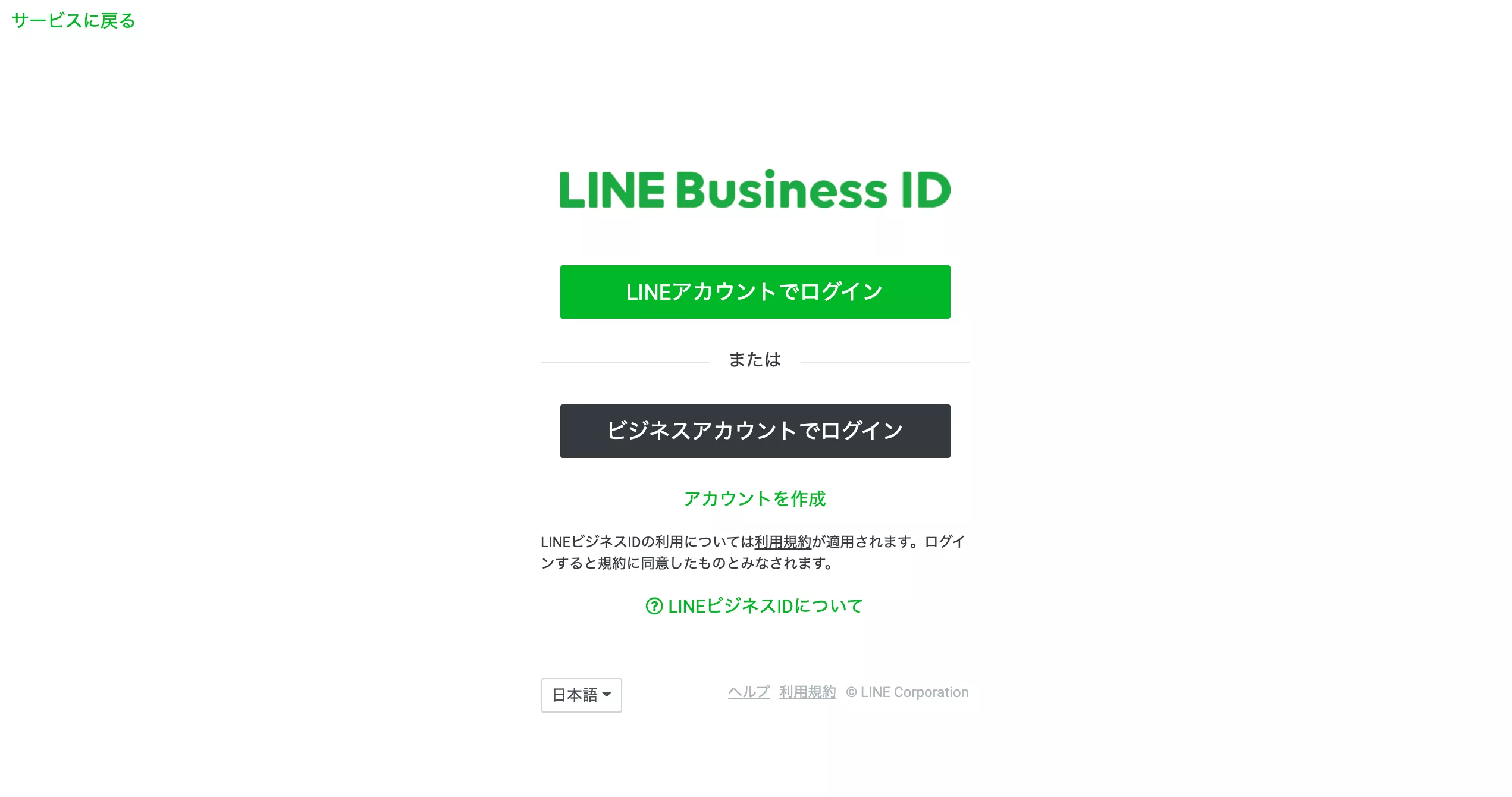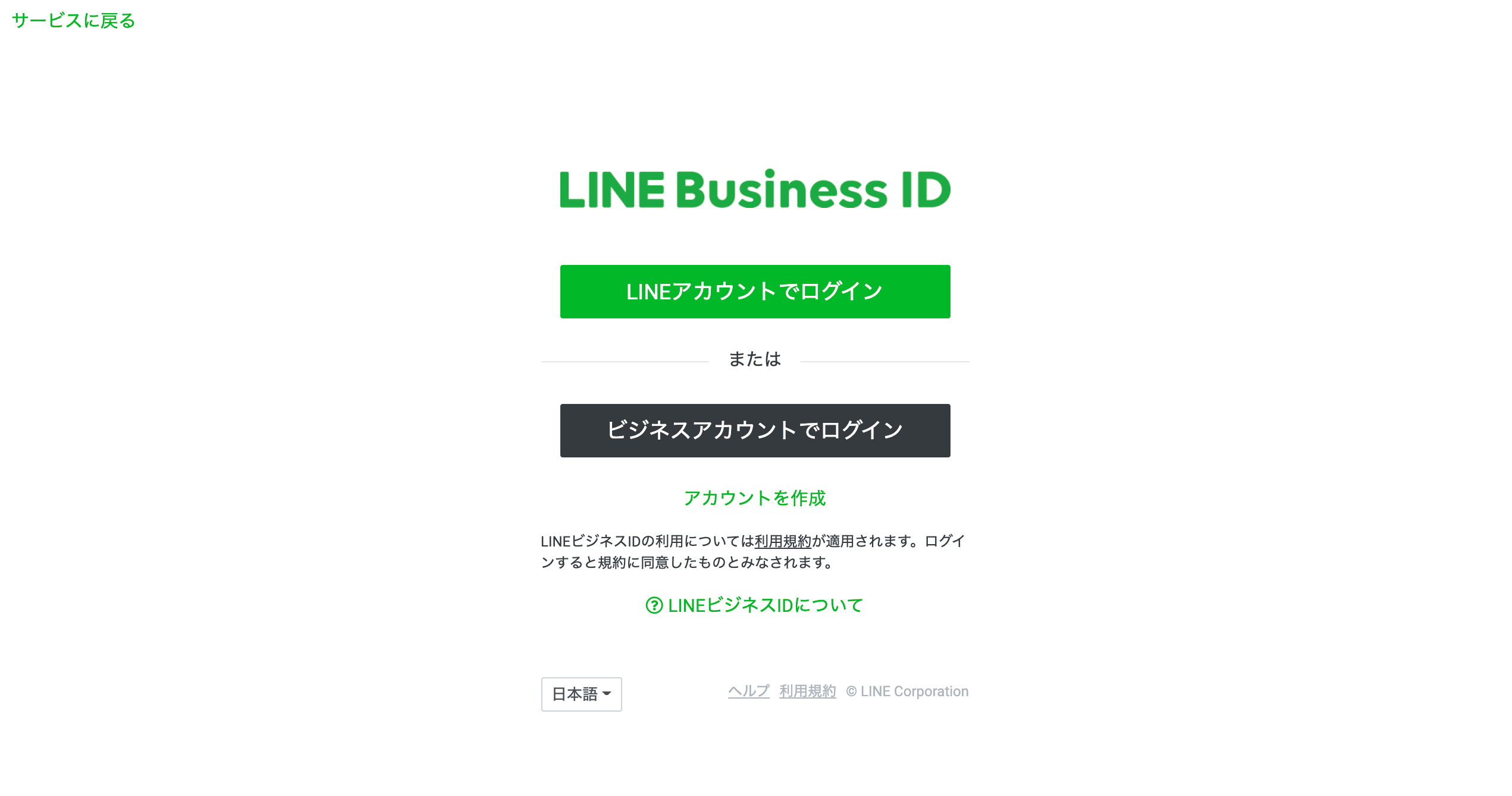 2. LINEアカウントでのログイン、またはメールアドレスのみで利用できるビジネスアカウントでのログインを行います。「LINE Business ID」についてご不明の場合はこちら