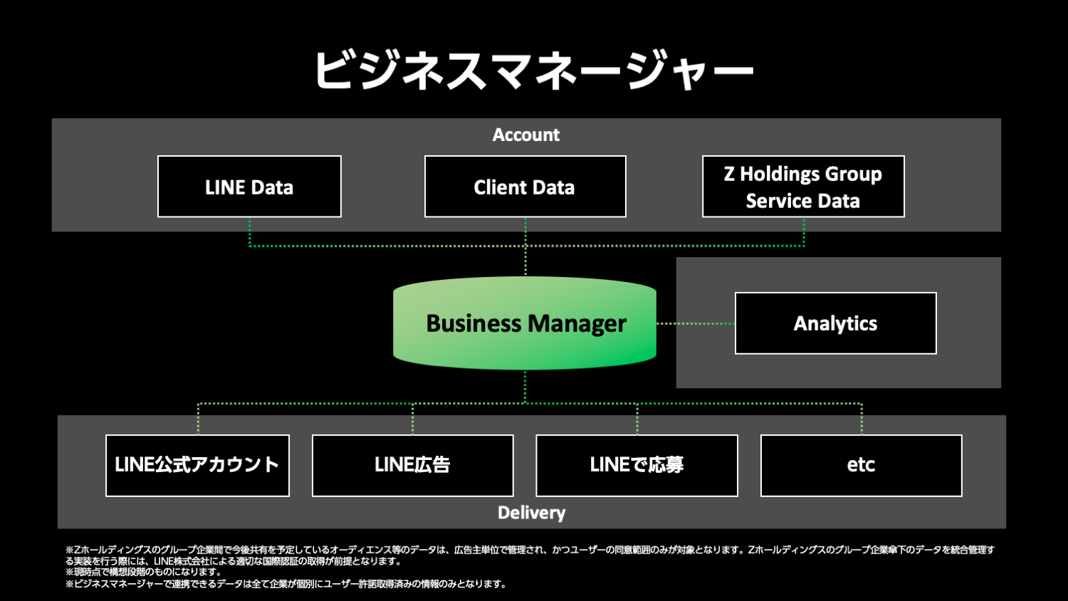 「ビジネスマネージャー」は、 LINEの法人サービスを通じて当社がユーザーの許諾を得て取得したデータと、広告主が持つ自社データを統合して管理できるサービスです。複数の広告サービスのアカウントのデータを、LINE公式アカウントやLINE広告での配信に利用することができます。将来的には、Zホールディングス傘下のグループ企業が提供している各サービスのデータ*4についても、広告主単位での統合を検討しております。まずは、Yahoo! JAPANのサービスへの広告配信や、複数の広告サービスでのリーチ計測やアトリビューション分析など、サービスを横断した広告配信の効果を可視化する分析を、ビジネスマネージャーを通じて提供できるように検討を進めています。