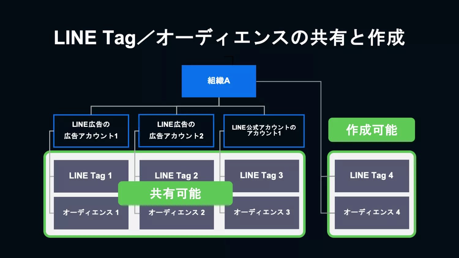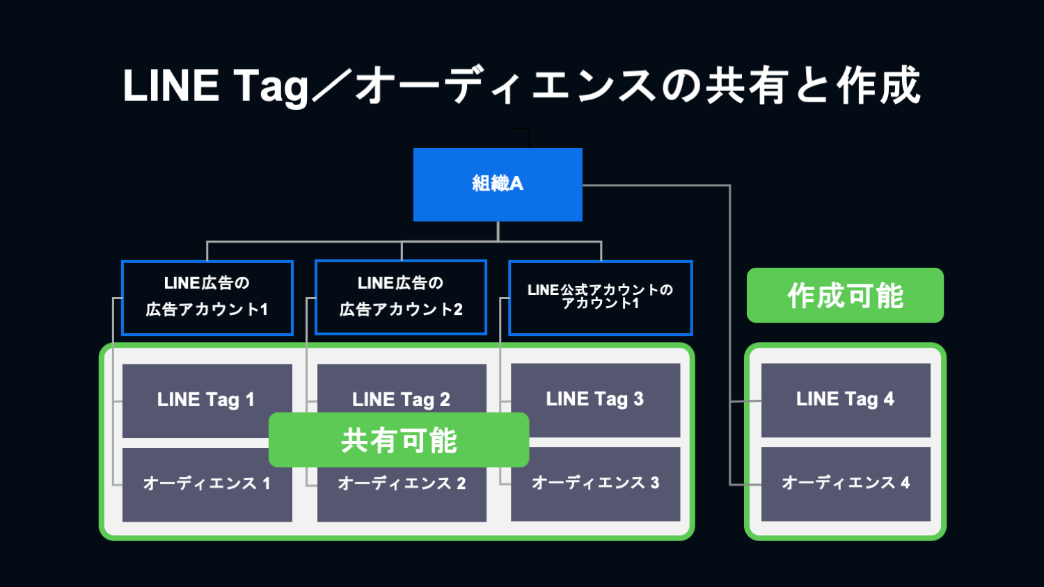 ・ビジネスマネージャー上でオーディエンスやLINE Tagを作成することが可能になります。作成したオーディエンスやLINE Tagは「組織」に接続されているアカウントに共有して利用可能です。