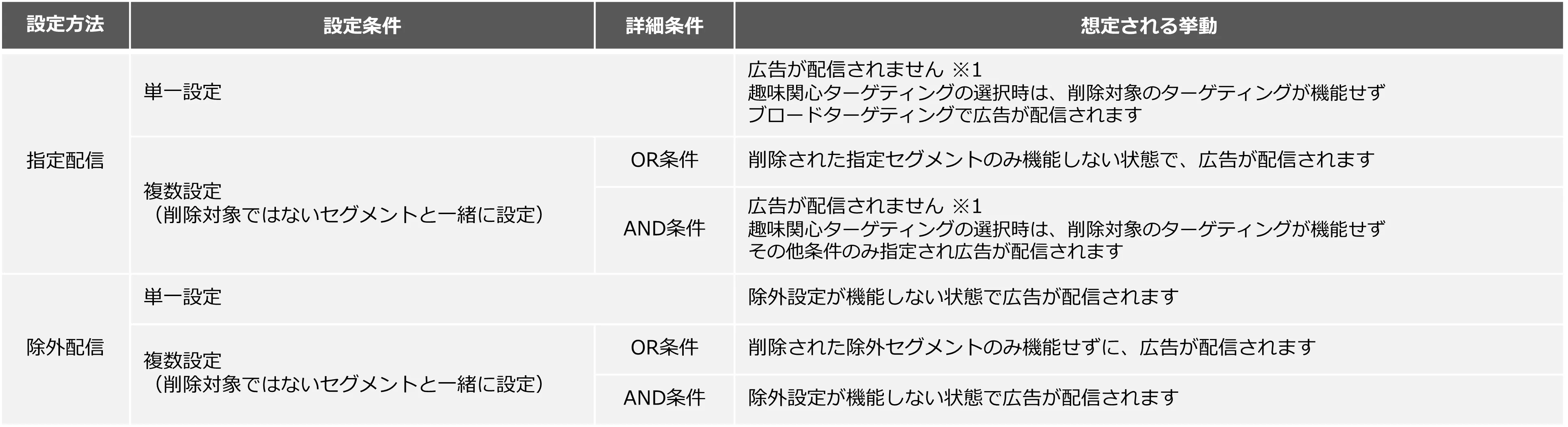 セグメントの削除は、段階的に実施予定です。7月27日の12:00以降にオーディエンスが徐々に減少し、順次利用が不可となります。趣味関心のセグメントに関してはアップデート適用時、順次セグメントが利用不可となります。
