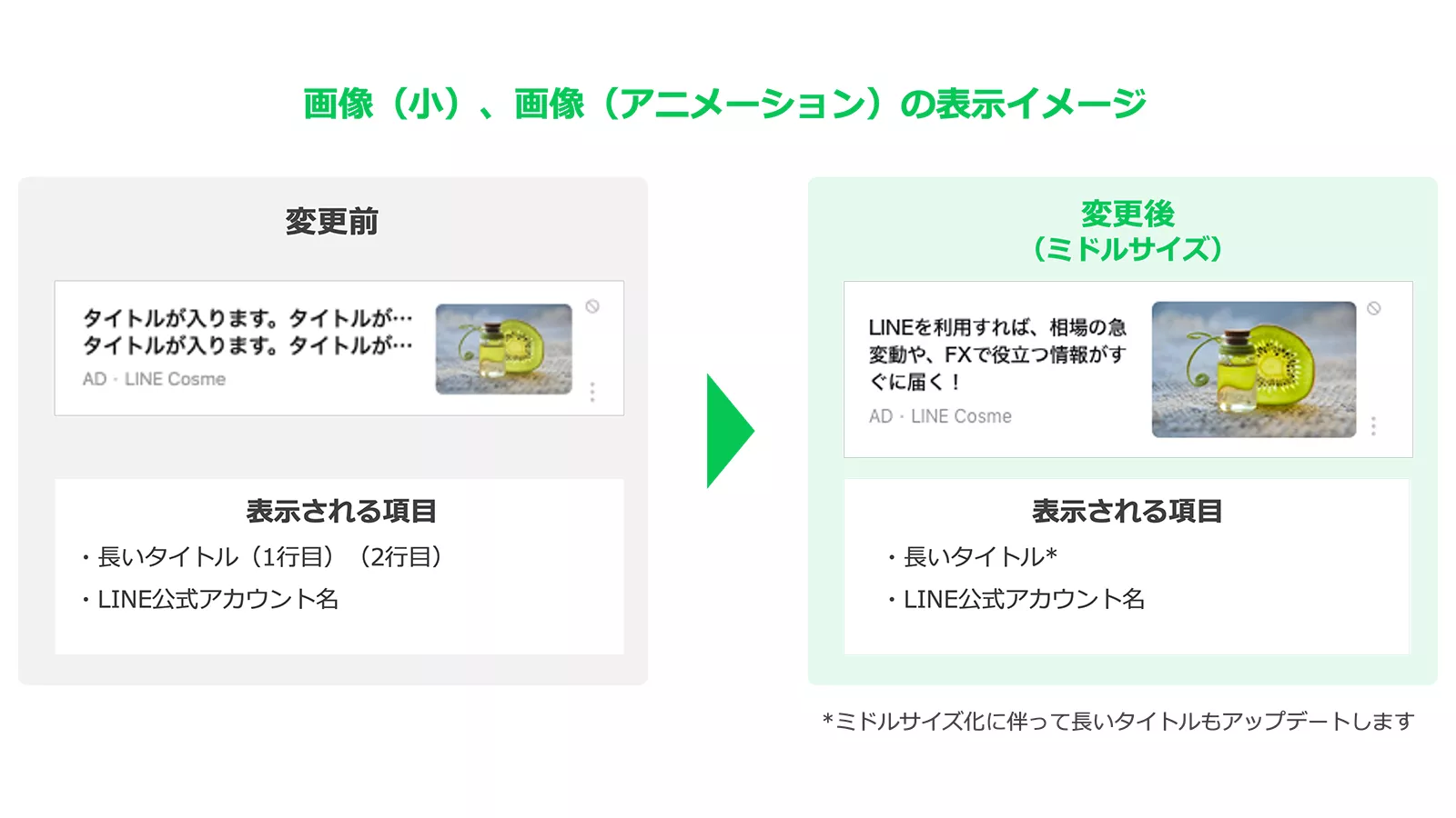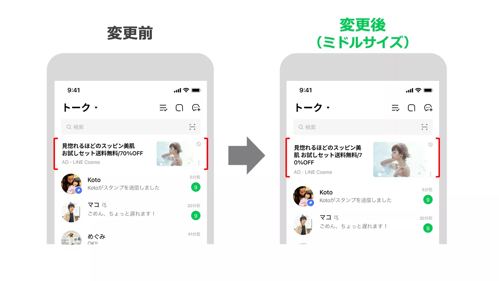 ABテストを実施していたトークリストの広告サイズ「ミドルサイズ」を正式にリリースしました。LINE広告とTalk Head View(Talk Head View Custom含む)で、ミドルサイズが適用されます。