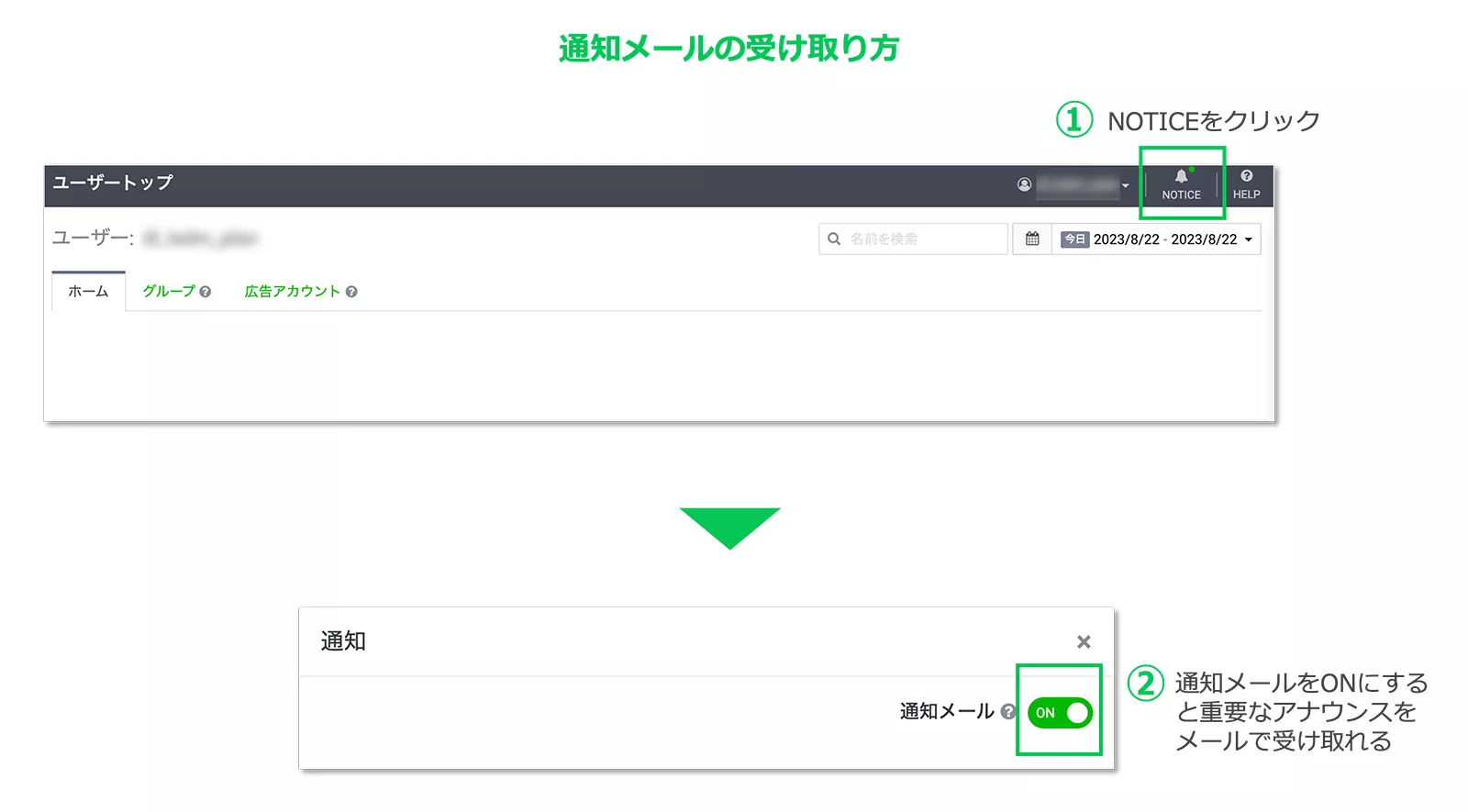LINE広告の管理画面のホーム中央にある「お知らせ」に表示されるアナウンスを、通知メールで受け取れるようになります。