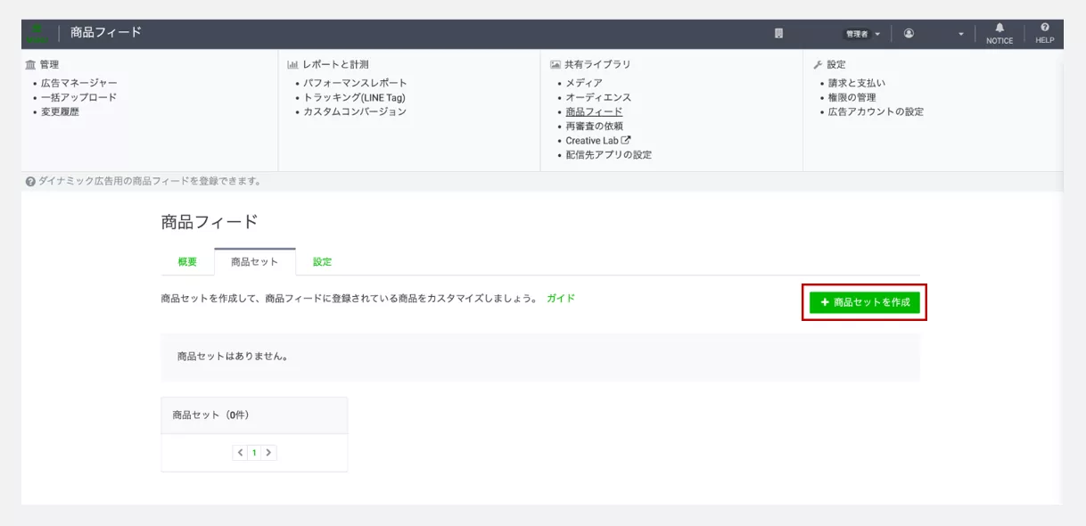 商品セット設定の際は、[商品フィード]の[商品セット]を開いて、[商品セットを作成]をクリックします。