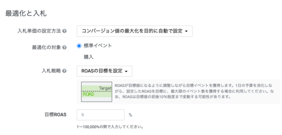 標準イベント(購入)における「目標ROASの達成」を目的に自動入札を最適化する機能で、ROASが目標値になるように維持したい場合に適しています。