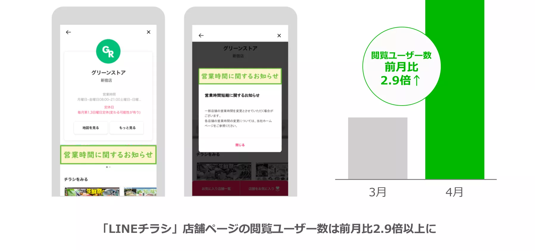 また、現在ドラッグストアやスーパー、家電量販店などの小売店情報は、新型コロナウイルス感染症の影響により大幅に需要が拡大しており、商品の在庫・入荷状況や店舗の営業時間変更などの情報を「LINEチラシ」の店舗ページ上で配信できるようにした結果、4月時点で店舗ページの閲覧ユーザー数が前月比2.9倍以上に増加いたしました。