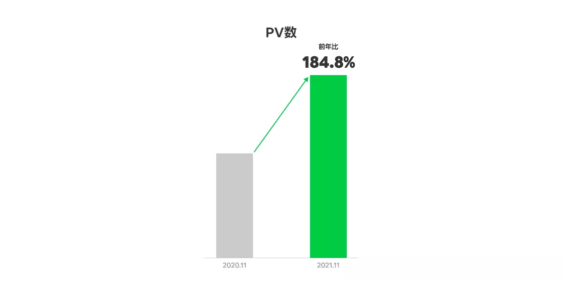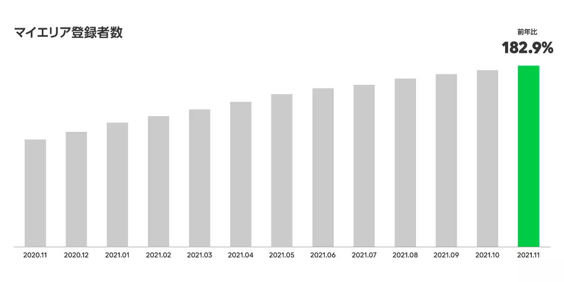 「LINEチラシ」は2021年10月でサービス提供開始から2周年を迎え、 ユーザー数*3も1,750万人を突破し、前年比約141%増と成長を続けております。また、「LINEチラシ」上での掲載店舗数は40,000店以上で前年比約194%増、マイエリア*4登録者数は前年比約183%増、PV数も前年比約185%増と引き続き増加しています。中でも、「LINEチラシ」上で気になる店舗をお気に入りとして登録することができる”お気に入り追加”数は、11月で1,000万を突破し前年比約191%増となり、サービスを日常的にお使いいただいているユーザーが増えていることもうかがえます。