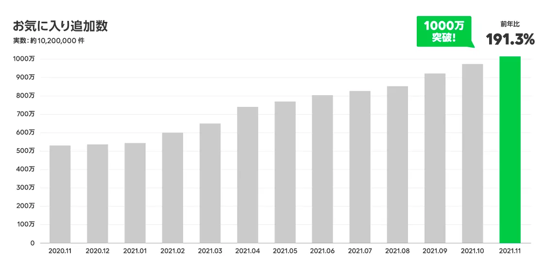 ■お気に入り追加数1,000万を突破!LINE内サービスとの連携強化やユーザーの計画購買行動の定着により、ユーザー数、マイエリア登録者数、PV数も引き続き増加