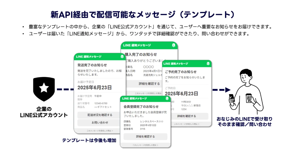 • 荷物の配送予定や公共料金の案内など大事なお知らせを「LINE公式アカウント」の友だち以外にも送れる「LINE通知メッセージ」を法人向けに大幅リニューアル