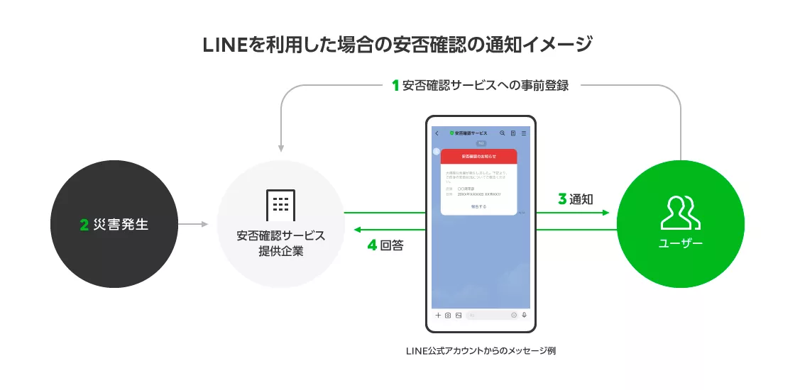 企業や学校、自治体はそれらの「安否確認サービス」を利用し、多くの人が日ごろ使い慣れている「LINE」を通じて安否確認の連絡を送ることで、「安否確認サービス」の連絡に気付いてもらいやすくなり、通知を受け取った従業員や生徒、住民は安否状況をリアルタイムに報告することができます。
