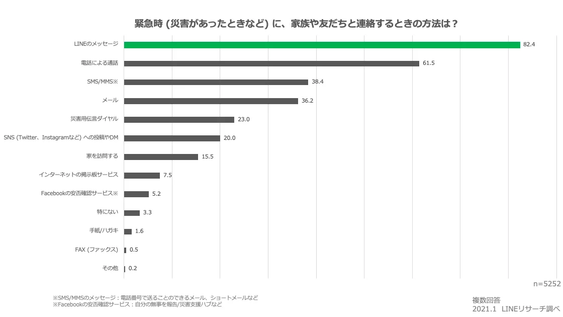LINEが運営するリサーチプラットフォーム「LINEリサーチ」において、日本全国の15歳~59歳の男女を対象に、災害などの緊急時における家族や友人への連絡方法について調査した結果、82.4%が「LINEのメッセージ」を利用すると回答しました。次いで「電話による通話」が61.5%、「SMS/MMSのメッセージ(電話番号で送ることのできるメール、ショートメールなど)」が38.4%、「メール」が36.2%と、「LINEのメッセージ」が電話やメールなどを上回る結果となりました。