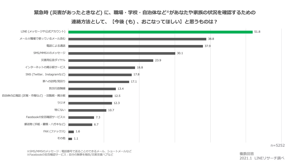 さらに「緊急時に職場・学校・自治体などが安否状況を確認するために今後(も)おこなってほしい連絡方法」では「LINE」が約5割ともっともニーズが高い結果に