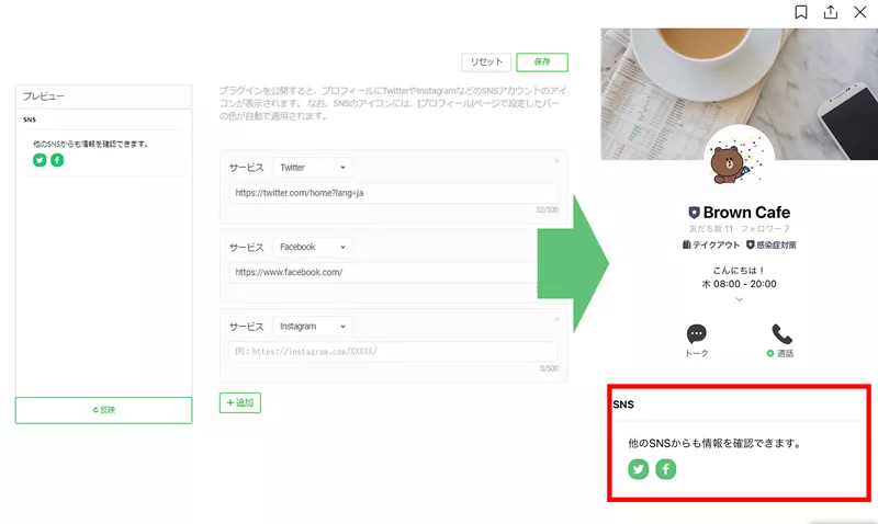 「SNSプラグイン」にURLを設定することで、LINE公式アカウントのプロフィールにSNSへのリンクを表示することができるようになりました。Web版管理画面および管理アプリのプロフィールページから設定できます。