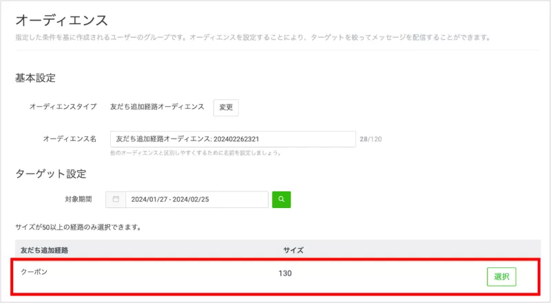 ※オーディエンスに利用するには50人以上のオーディエンスサイズが必要です。