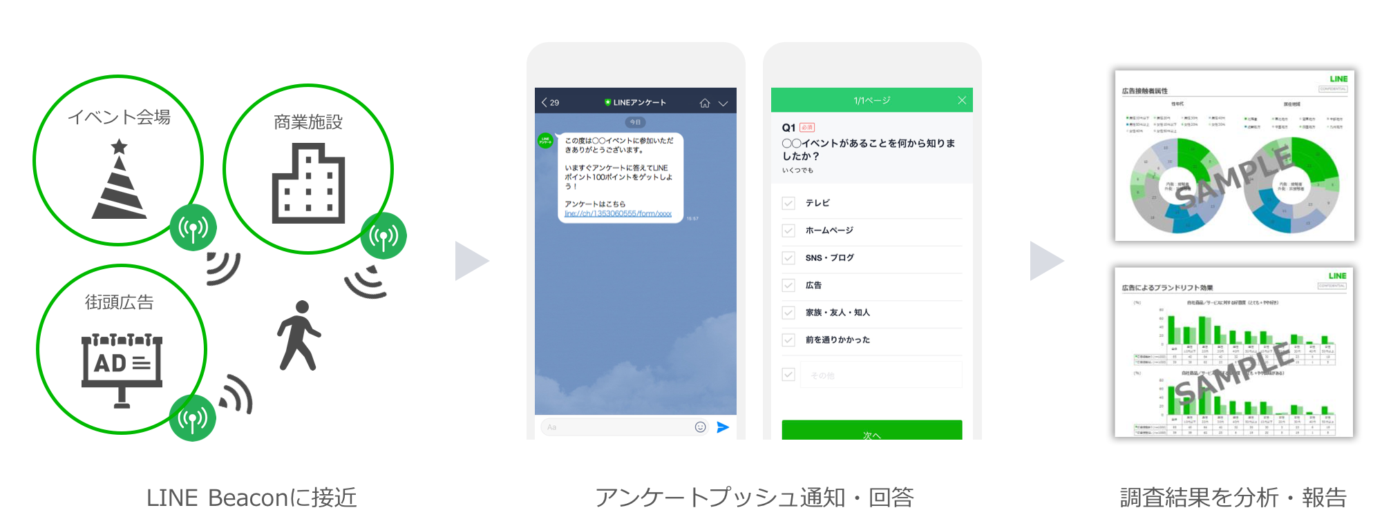 この度「LINEリサーチ」では、「LINE Beacon」*1を利用した、通行人や、イベント参加者等を対象に調査を行うことが可能な位置連動型リアルタイム調査「ビーコン調査」の提供を新たに開始いたしました。