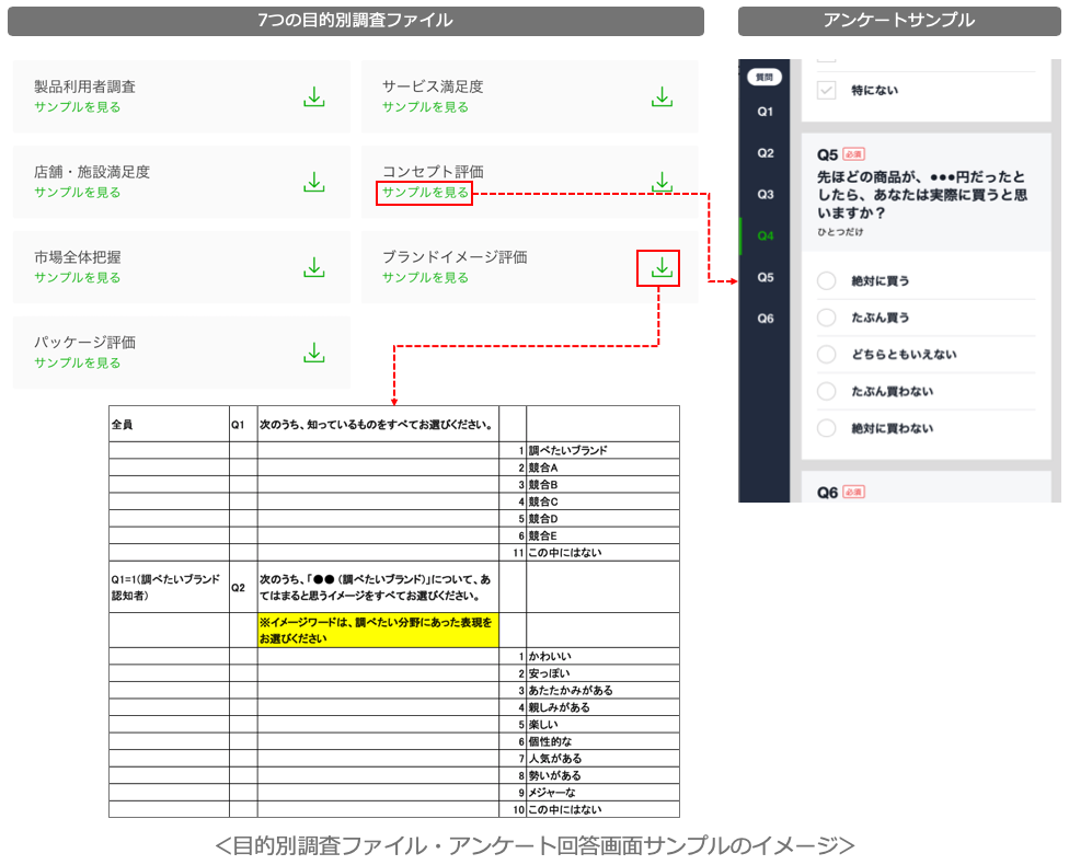 多くの方々に「ライトコース」をご利用いただく一方で、一部の調査に慣れていない利用者からは「調査ファイルの作成が難しく時間がかかる」「設問や構成など、どのようなアンケートを作成するべきか悩んでいる」という声もありました。そのような利用者の声を受け、この度「ライトコース」では、新たな機能として、調査ファイルのテンプレート「目的別調査ファイル」をリリース。実用性の高い7種類(製品利用者調査、サービス満足度、店舗・施設満足度、コンセプト評価、市場全体把握、ブランドイメージ評価、パッケージ評価)のテンプレートの提供を開始しました。初めて調査を実施する方や、調査項目が明確に決まっていない方でも、テンプレートの設問内で商品名や社名を編集するだけで、簡単に目的に合ったアンケートを作成できます。 また、調査目的に迷う場合も、すべてのテンプレートの「アンケート画面」や「レポート」のサンプルを閲覧できるため、どの調査ファイルが目的に合っているかをイメージすることができます。