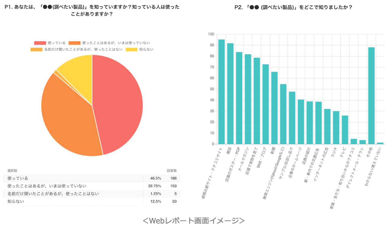 調査結果をWeb上で確認できる「Webレポート画面」の提供も開始しました。これまでは、調査結果をエクセルファイルでのみ提供していたため、ファイルダウンロードに手間がかかり、調査結果を示すグラフの種類にも限りがありました。今回新たに提供する「Webレポート画面」は、調査終了後すぐに各調査結果に適した形式のグラフで調査結果を確認できます。また、プレゼン資料や報告書への活用ニーズにも合わせ、グラフの印刷やPDF形式での保存も可能になりました。さらに、今後は質問内容に合わせてグラフの種類も増やしていく予定です。