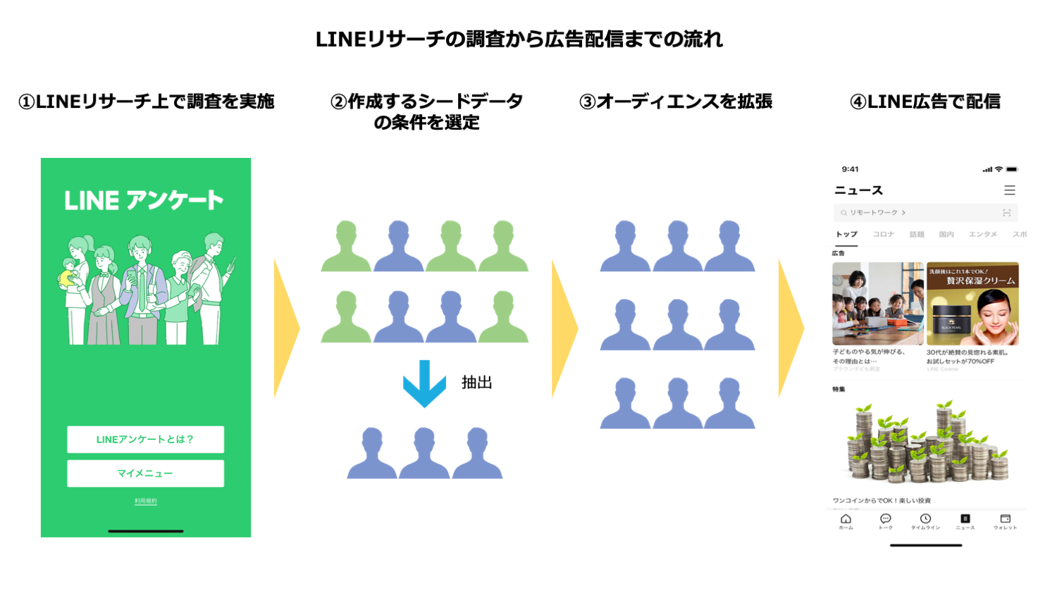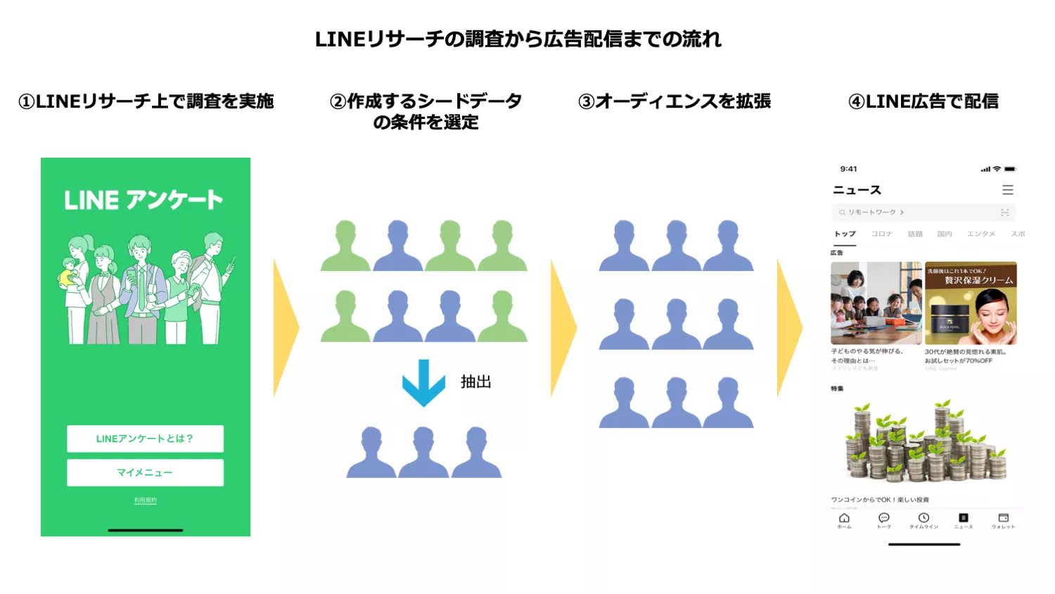 ■LINEリサーチの調査結果データをLINE広告の類似配信のシードデータとしても活用できることで、より直線的なマーケティング戦略の立案・実行が可能に