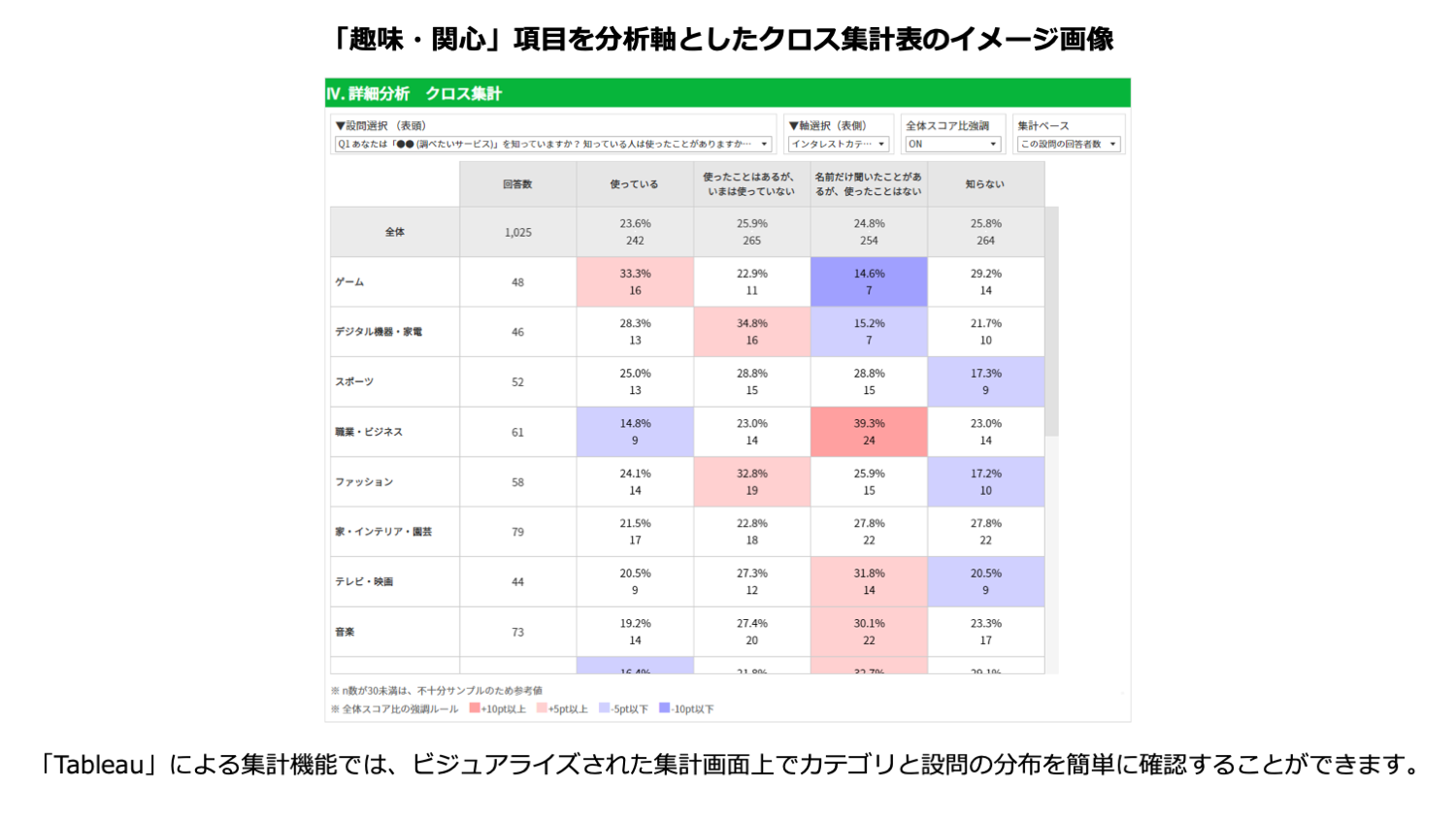 LINE広告の詳細ターゲティング項目である「趣味・関心」を軸として、得られた調査結果とリーチしたいターゲットの分布を「Tableau」上で確認することができます。調査結果データ作成後、すぐに「Tableau」上の集計表から確認ができるため、調査から広告配信の戦略立案までをよりスムーズに精度よく行うことが可能です。
