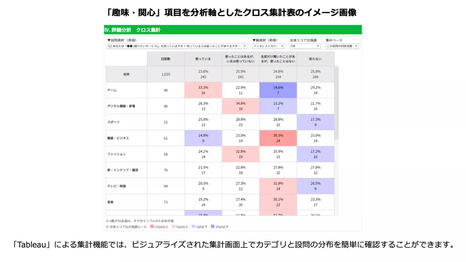 「ライトコース」では、2020年12月より「Tableau」による集計機能を追加しており、設問同士のクロス集計や、自由入力回答の絞り込み機能などが利用可能となったため、調査集計の専門的な知識を持たない人でも簡単に・詳細にデータを分析することができるようになりました。