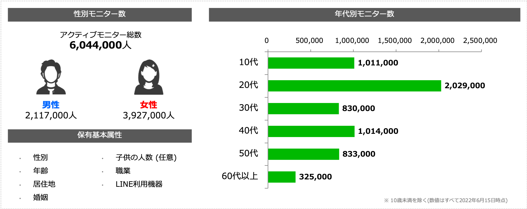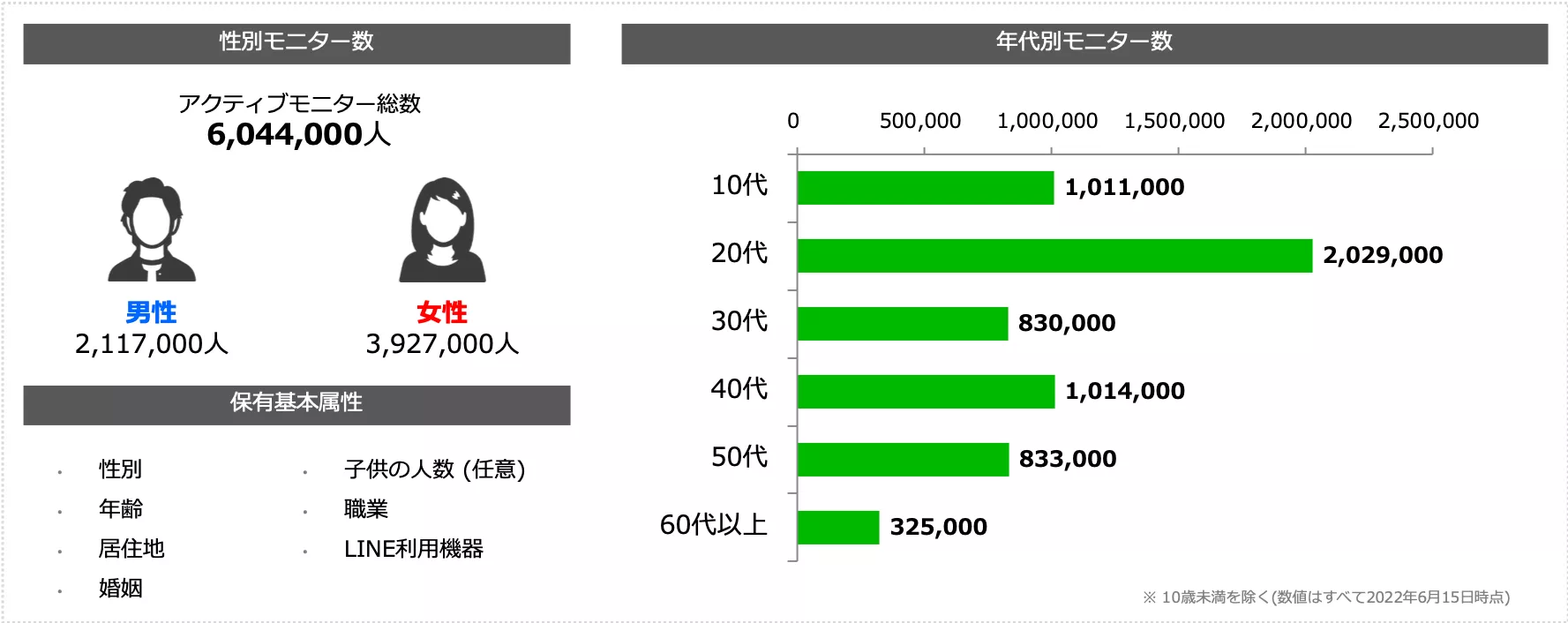 <LINEアンケートモニターの性別・年代別の詳細(2022年6月15日時点)>