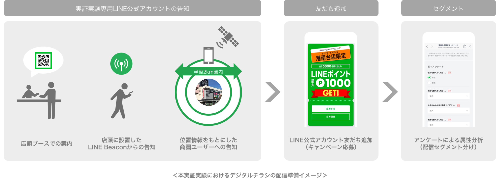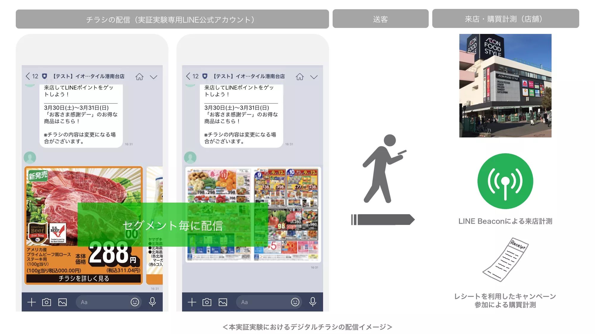 今回の実証実験では、「イオンフードスタイル港南台店」の本実証実験専用LINE公式アカウントを利用し、当該アカウントの「友だち」(登録ユーザー)に向け、2種類のデジタルチラシを属性別にターゲティング配信いたします。店頭に設置した「LINE Beacon」を利用することで、配信されたデジタルチラシを閲覧したユーザーの来店を計測いたします。