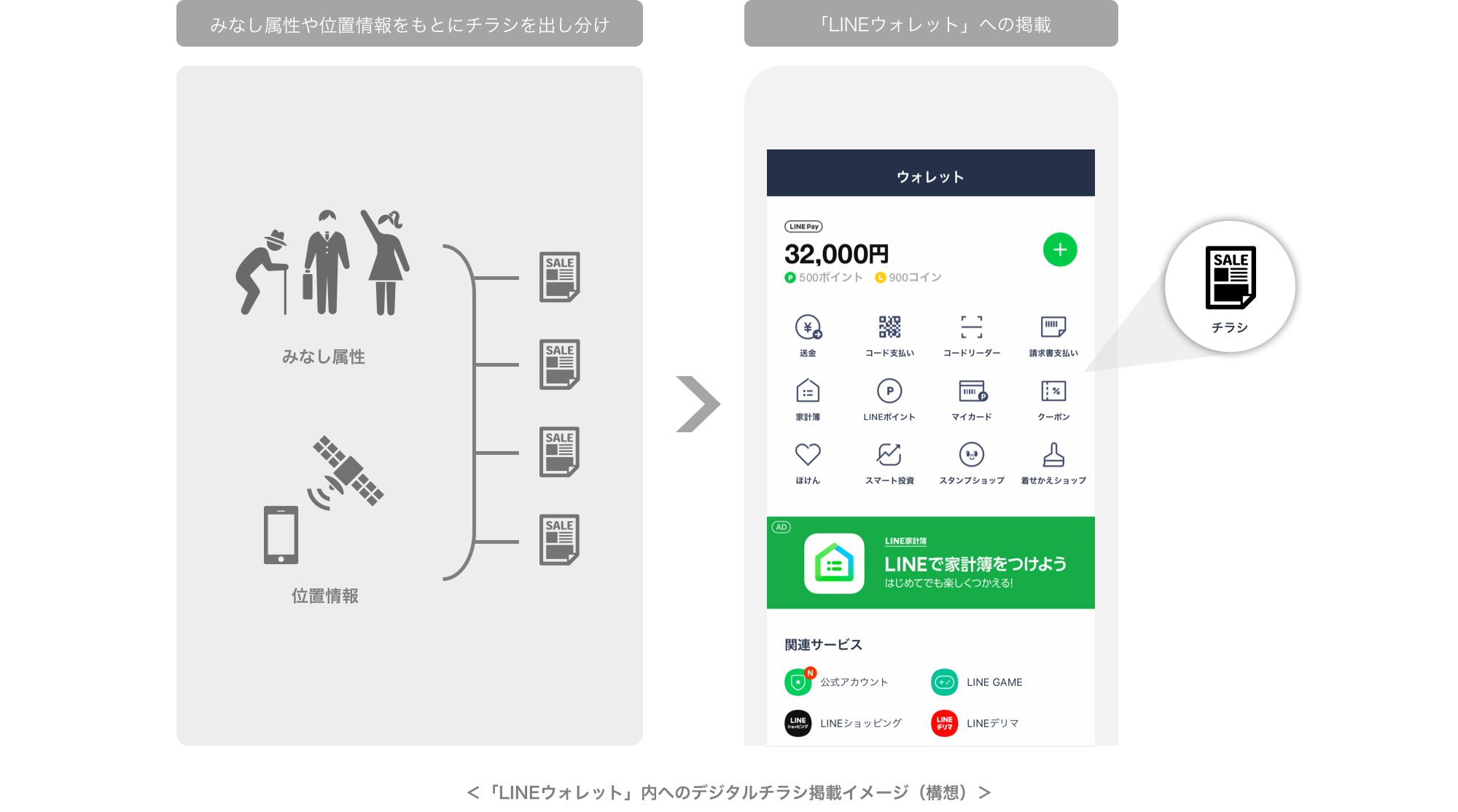 今後は、2018年3月より「LINE」アプリ内に設置された「LINEウォレット」内にデジタルチラシを設置するなどの展開も視野に、「LINE」を活用した販促ソリューションの 「店外」「店内」「購買」の3つの接点の中で、「店外(集客メディア)」の柱として展開してまいります。