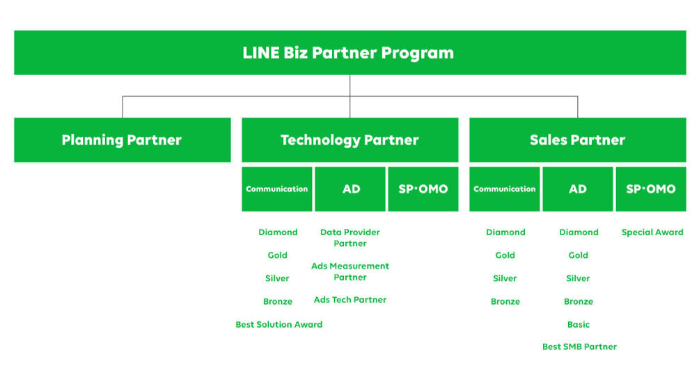LINE公式アカウントを中心軸とした広告サービスを対象とし、売上金額やアカウントの新規開設件数、保有しているアカウントの平均Push(IFAなど含む)配信数などを基準に認定され、特に優秀なパートナーは「Diamond」「Gold」「Silver」「Bronze」として認定されます。認定パートナー各社には、そのランクに基づき、新プロダクトの優先案内や営業サポート、LINEのメディアでの紹介やLINE主催イベントへの招待などの特典が付与されます。