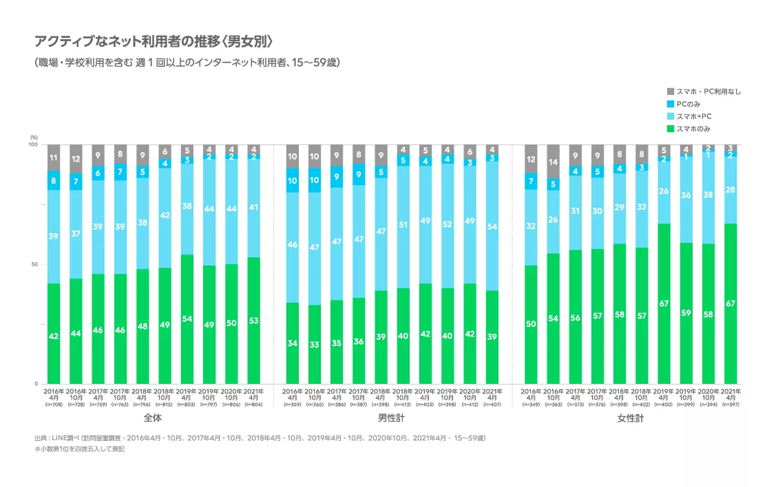 ・「スマホのみ」の利用者は、男性より女性の割合が高く、女性の67%が「スマホのみ」の利用と回答し、過去もっとも高い水準となった。