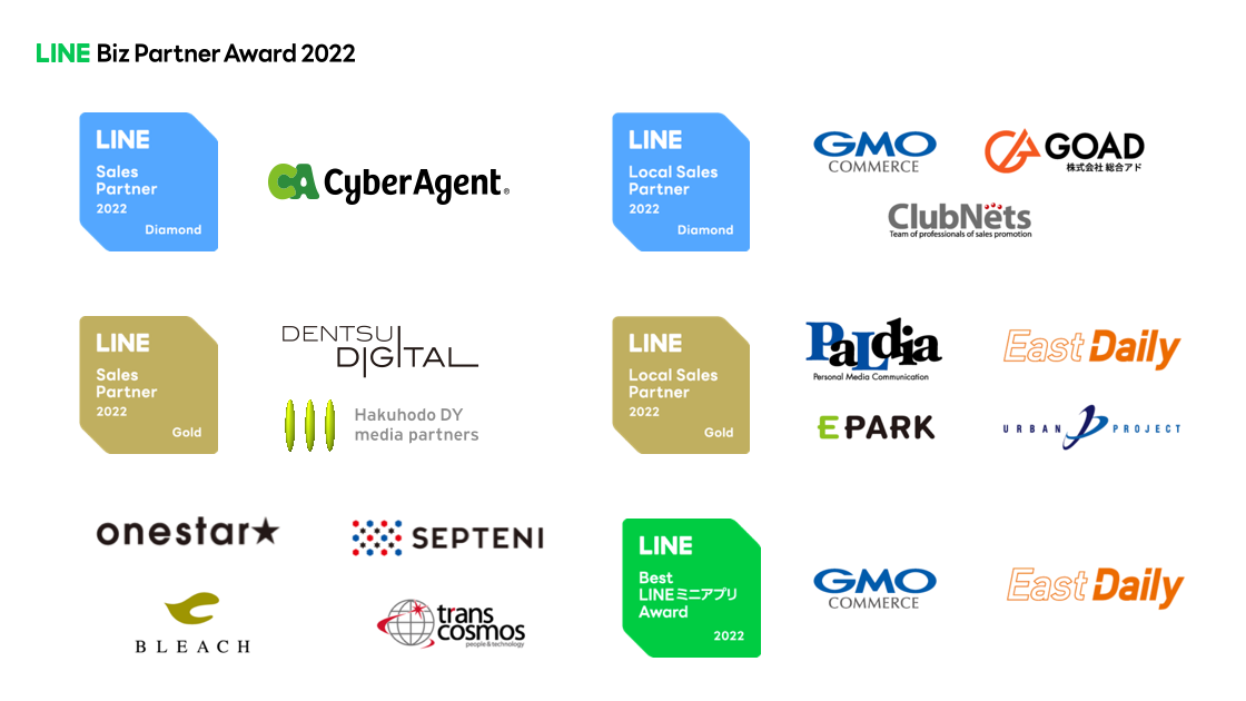 「LINE Biz Partner Program」において、2022年の認定パートナーのうち、表彰を受けたパートナーは以下のとおりです。
