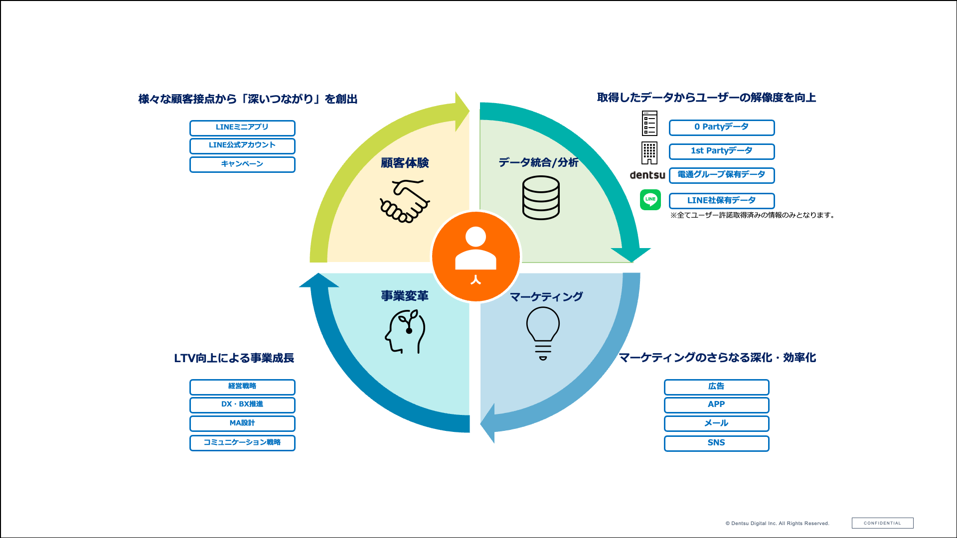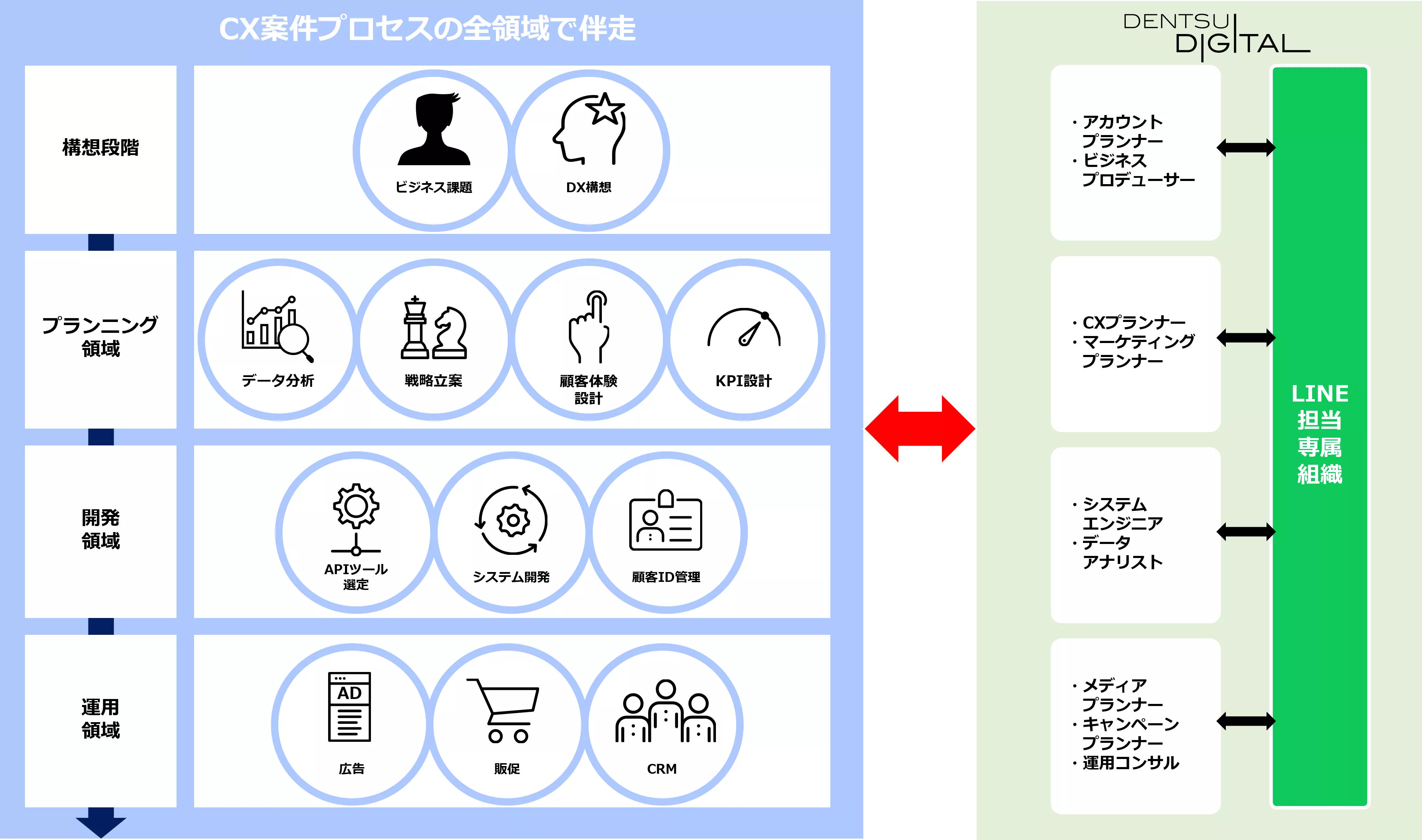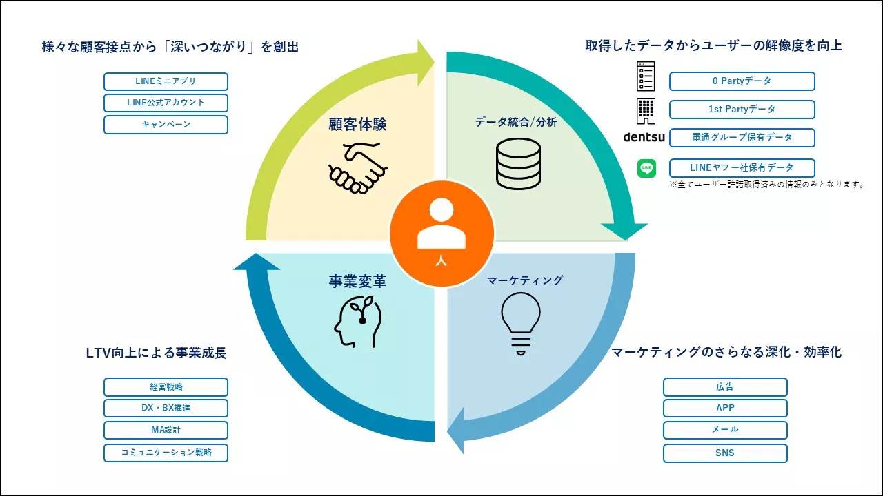 LINEやクライアントデータなどのアセットを活用した分析から、CX領域における全体構想、戦略立案から運用設計、施策実施までを幅広くリード。