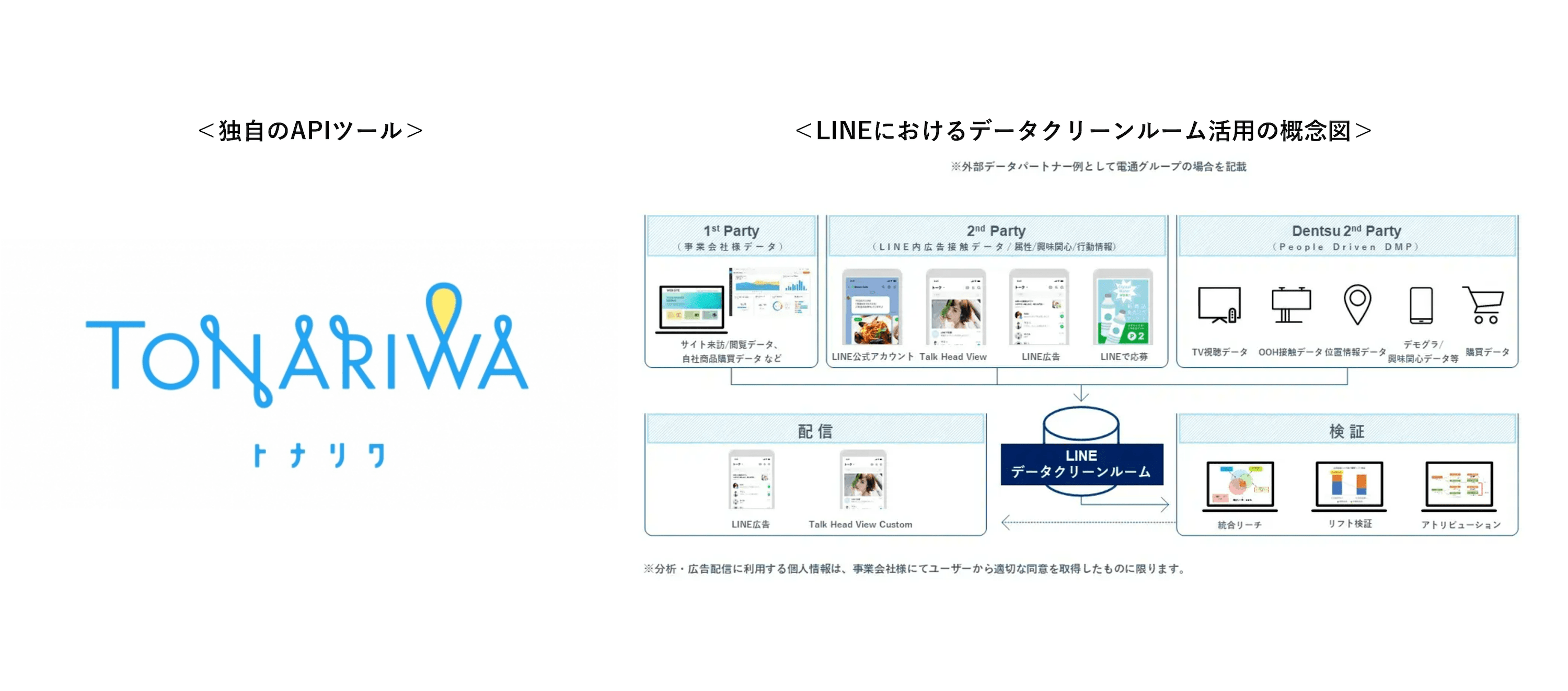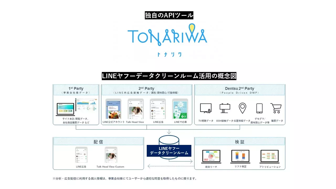 LINEを活用したデータクリーンルーム実績 業界トップ!1st Partyデータ×電通グループ保有データ×LINEヤフー社保有データを統合・分析し、マーケティングに活用することでユーザー体験の最大化が図れます。