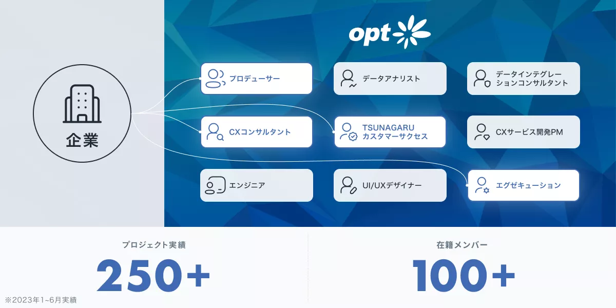 250件以上のプロジェクトに伴走してきた各領域のプロフェッショナル人材を個社のプロジェクトフェーズに合わせてアサイン可能。 -