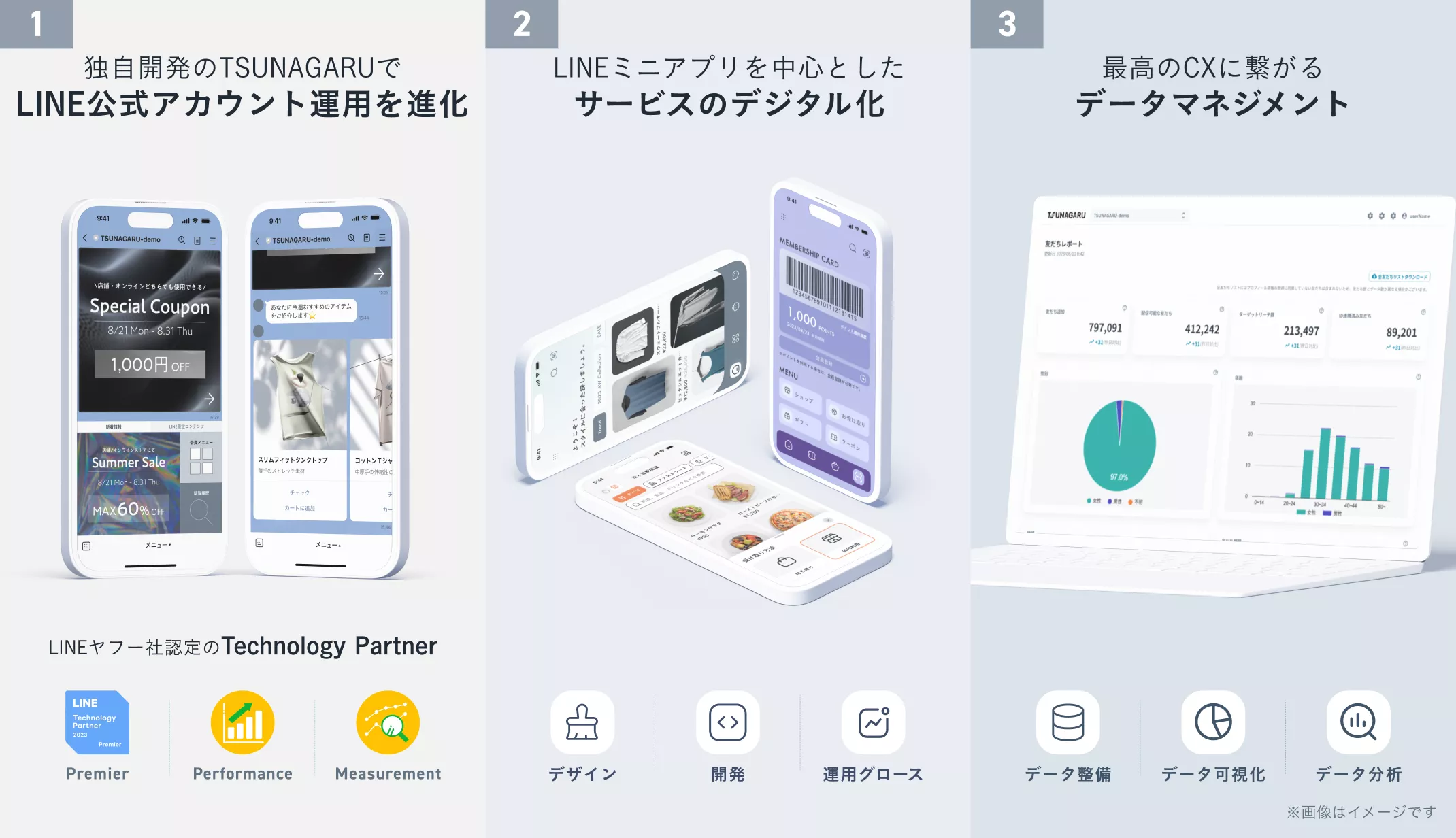 LINE公式アカウント運用の独自ツール「TSUNAGARU」の提供とコンサルティング支援。LINEミニアプリによる顧客接点開発、データマネジメント支援。