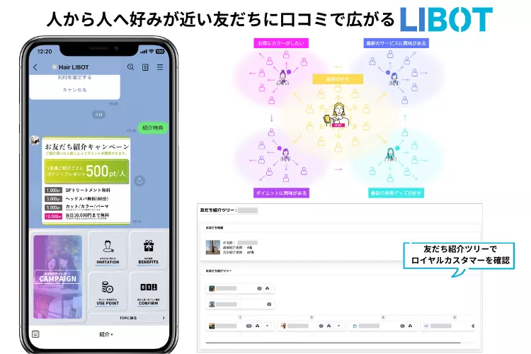 LIBOTは、ファンがファンを呼ぶ集客が特徴のLINEを活用したマーケティング支援システムです。口コミを促進する友だち紹介機能により、効果的な集客を支援します。